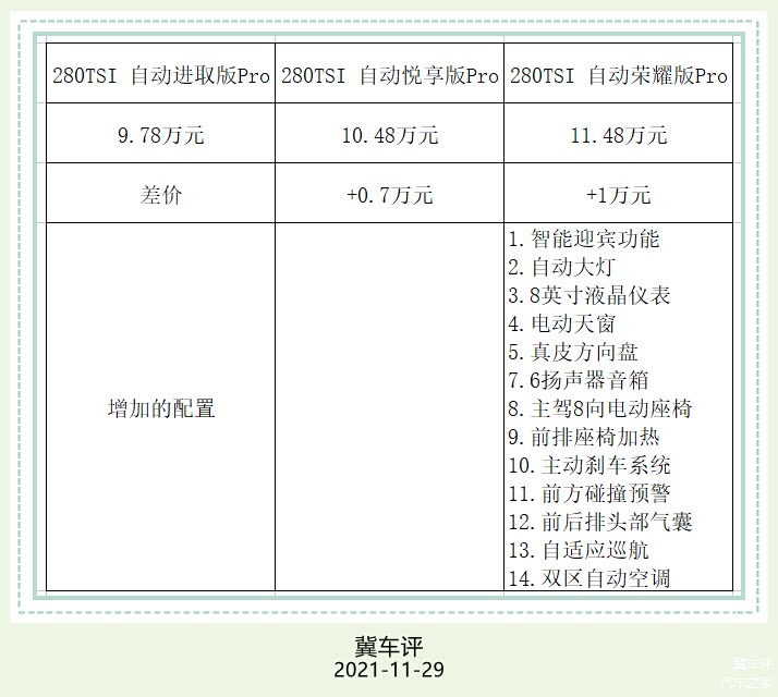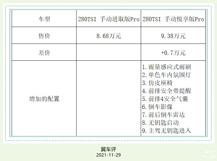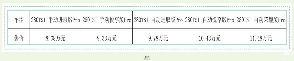 从车款的命名我们可以看出,自动挡标配和中配车型与手动挡两款车型命名是一样的,配置也是几乎一致的,一个是手动变速箱、一个是爱信6AT变速箱,自动挡两款车型多了一个运动驾驶模式切换,其余配置是一致的,所以就暂不表述了,重点看下顶配的捷达VS5 2022款 280TSI自动荣耀版Pro车型的配置单。顶配车型相较上一个配置悦享版差价增加了1万元,换来了多达14项的配置提升,且增加了这次改款车型的重点配置8英寸液晶仪表盘和前后排头部气囊、主动刹车系统、前方碰撞预警等安全性配置,以及升级了6喇叭的音响和双区自动空调、前排座椅加热、主驾电动座椅、天窗等舒适性配置,从1万元的差价来看非常值。所以笔者建议,如果各位不是预算特别紧张的话,那么顶配版捷达VS5 2022款 280TSI自动荣耀版Pro更值得购买。