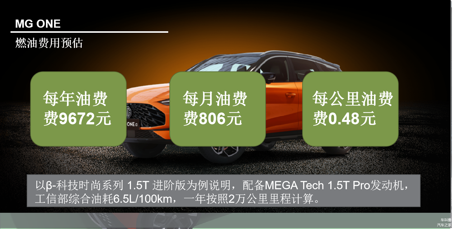 燃油这部分,我们以β-科技时尚系列 1.5T 进阶版为例说明,这款车型配备MEGA Tech 1.5T Pro发动机,工信部综合油耗6.5L/100km,可加注92号汽油,这是优点,当前92号汽油油价7.44元/L,一年按照2万公里里程计算。这样我们可以计算出MG ONE β-科技时尚系列 1.5T 进阶版每年的燃油费用在9672元左右,每公里燃油费用约0.48元。