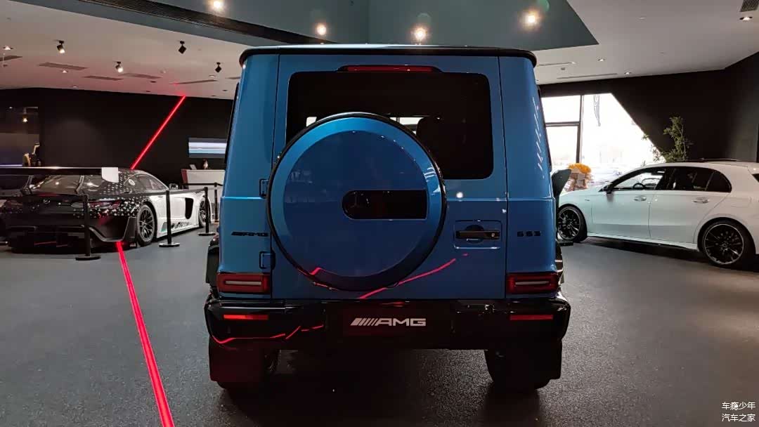 尾部的备胎也是奔驰G级极具辨识度的设计之一,此外,备胎外侧、“G63”和“AMG”标识以及下包围也经过熏黑处理,和车身其他地方保持一致。