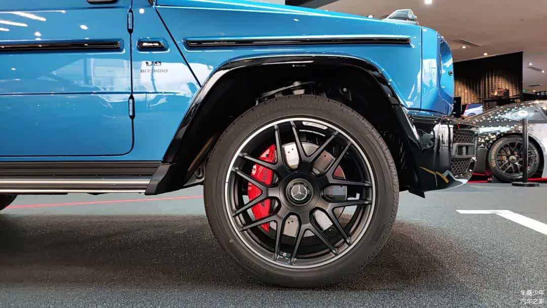 车身侧面的饰条和车顶同样经过了熏黑处理,这台车配备的是22英寸AMG黑色交叉轮辐锻造轮毂,和巨大的红色卡钳相搭配很有性能范,侧翼子板处还有“V8 BITURBO”的标识,当然作为AMG G63车型,位于车身两侧的排气管也是其最具辨识度的设计之一。其车身尺寸为4817mm/1931mm/1975mm,轴距2890mm。