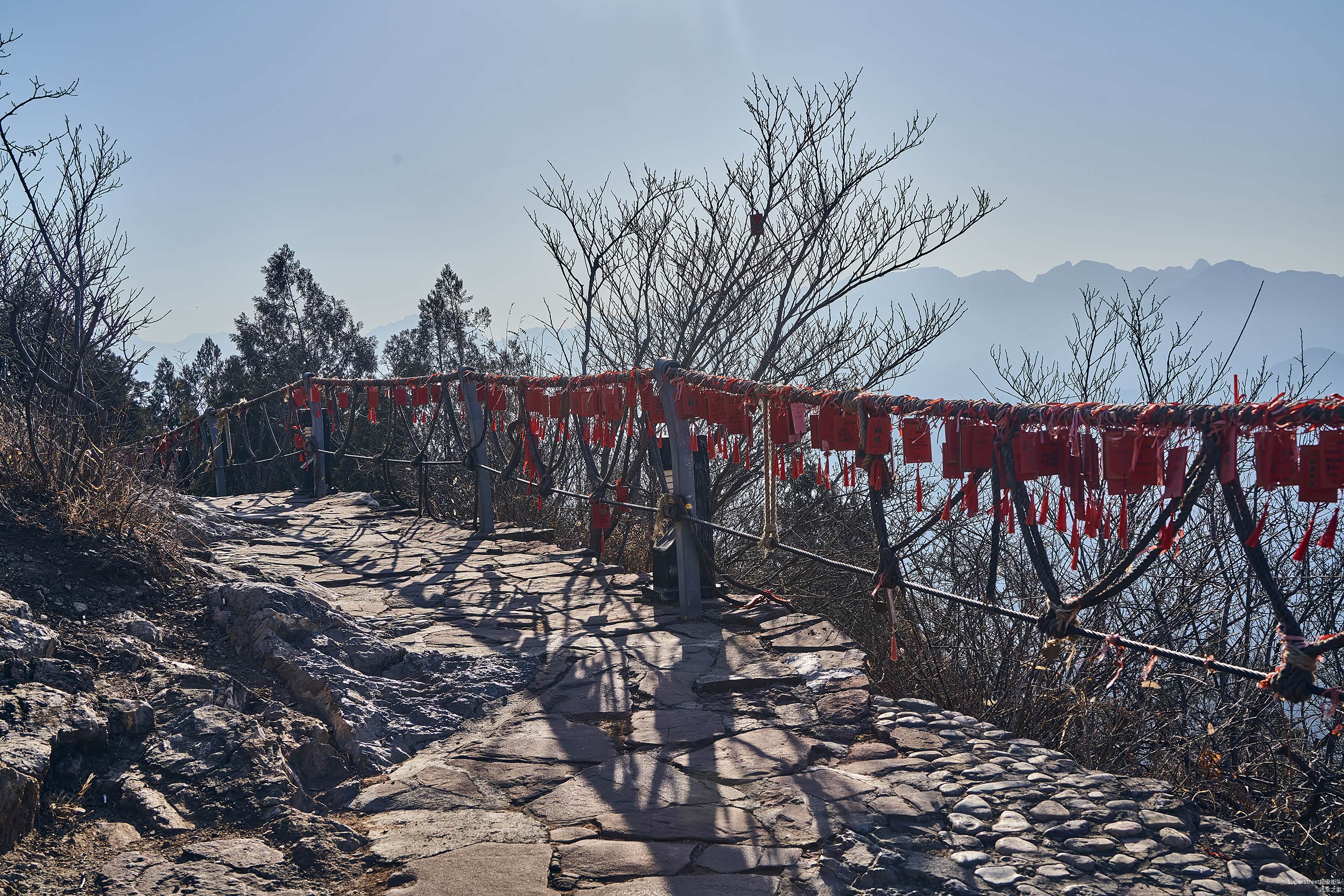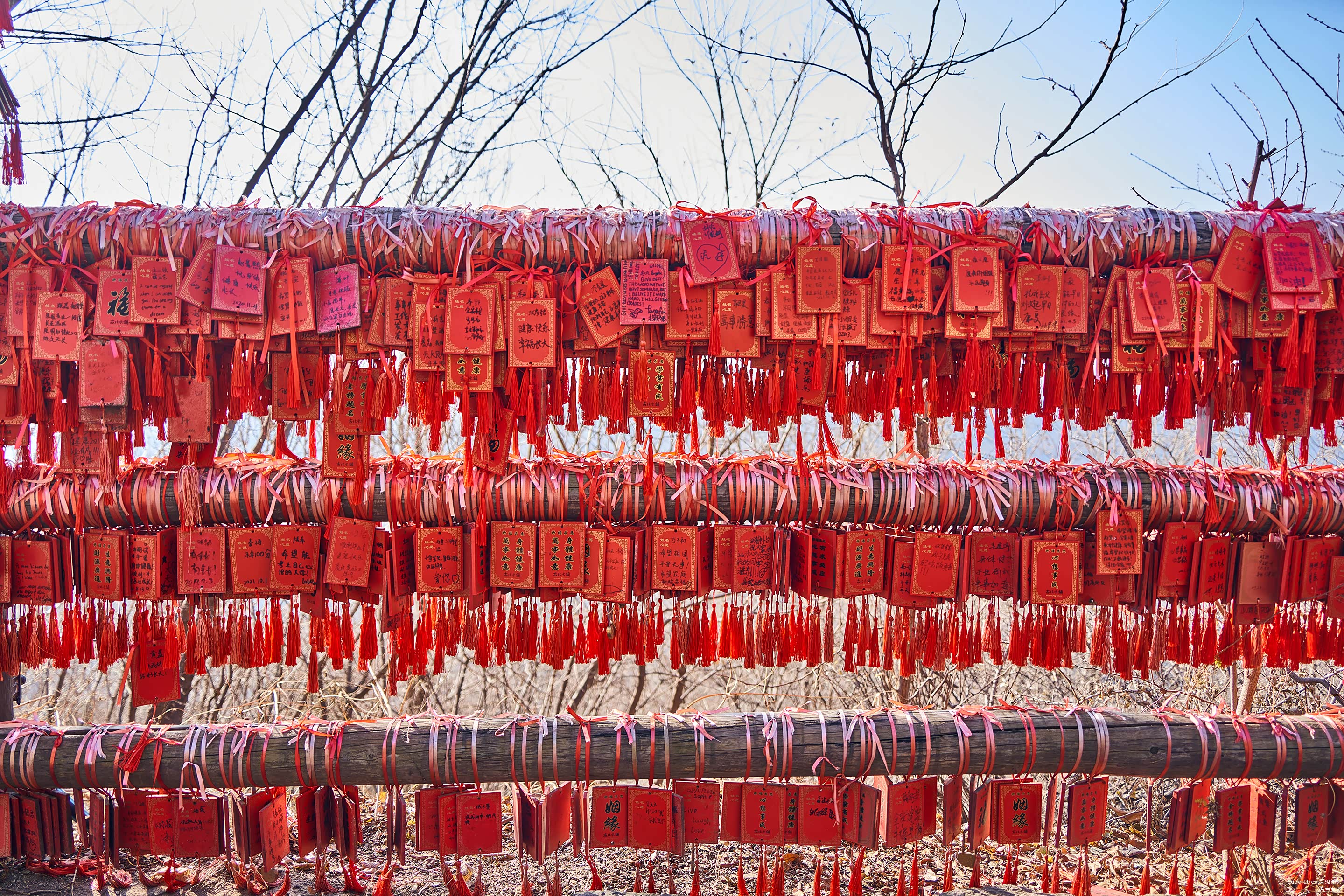 在通往缆车的山路中,栏杆上挂满了祈福的卡片,来自形形色色的旅客,写着各种各样的祝福语。