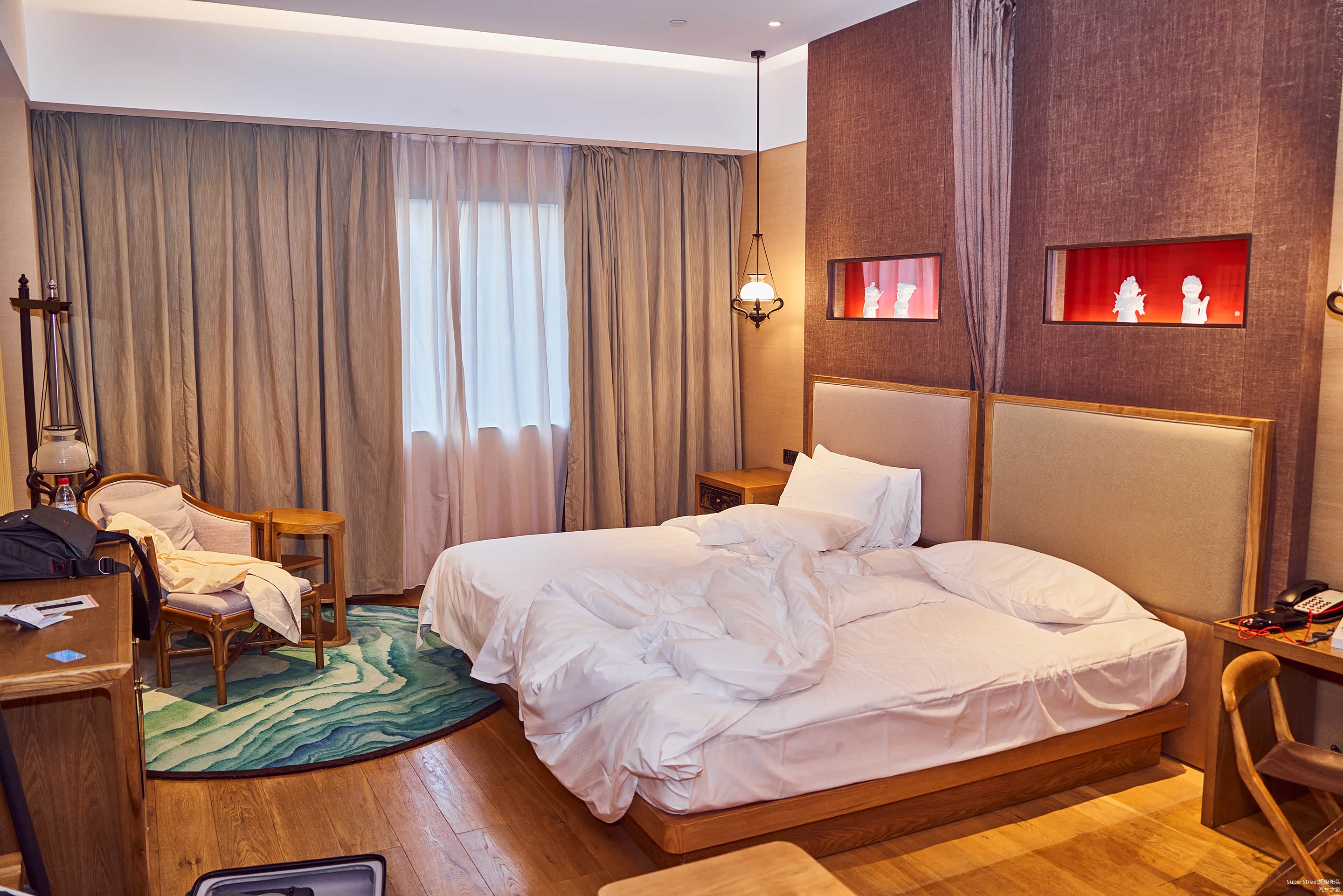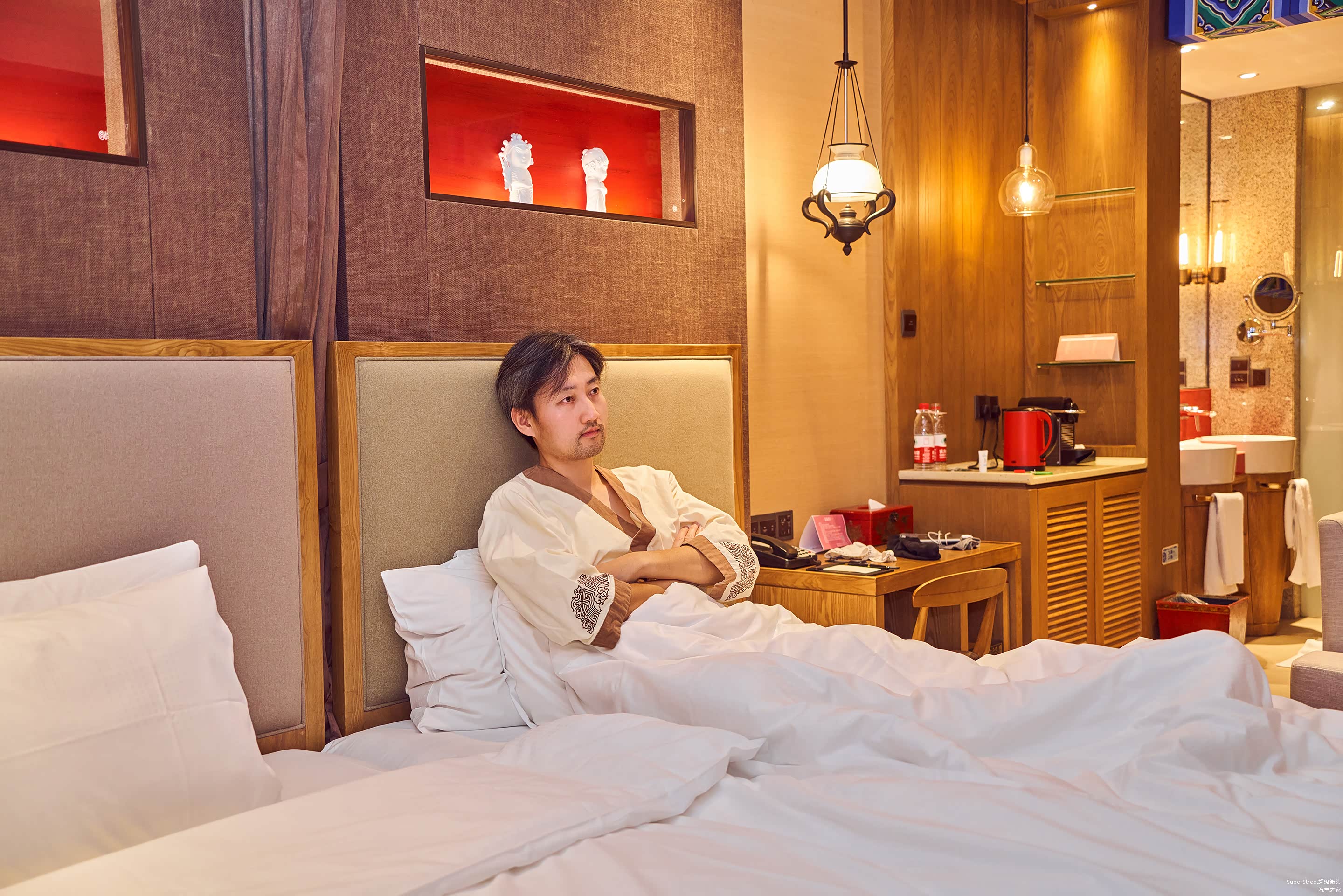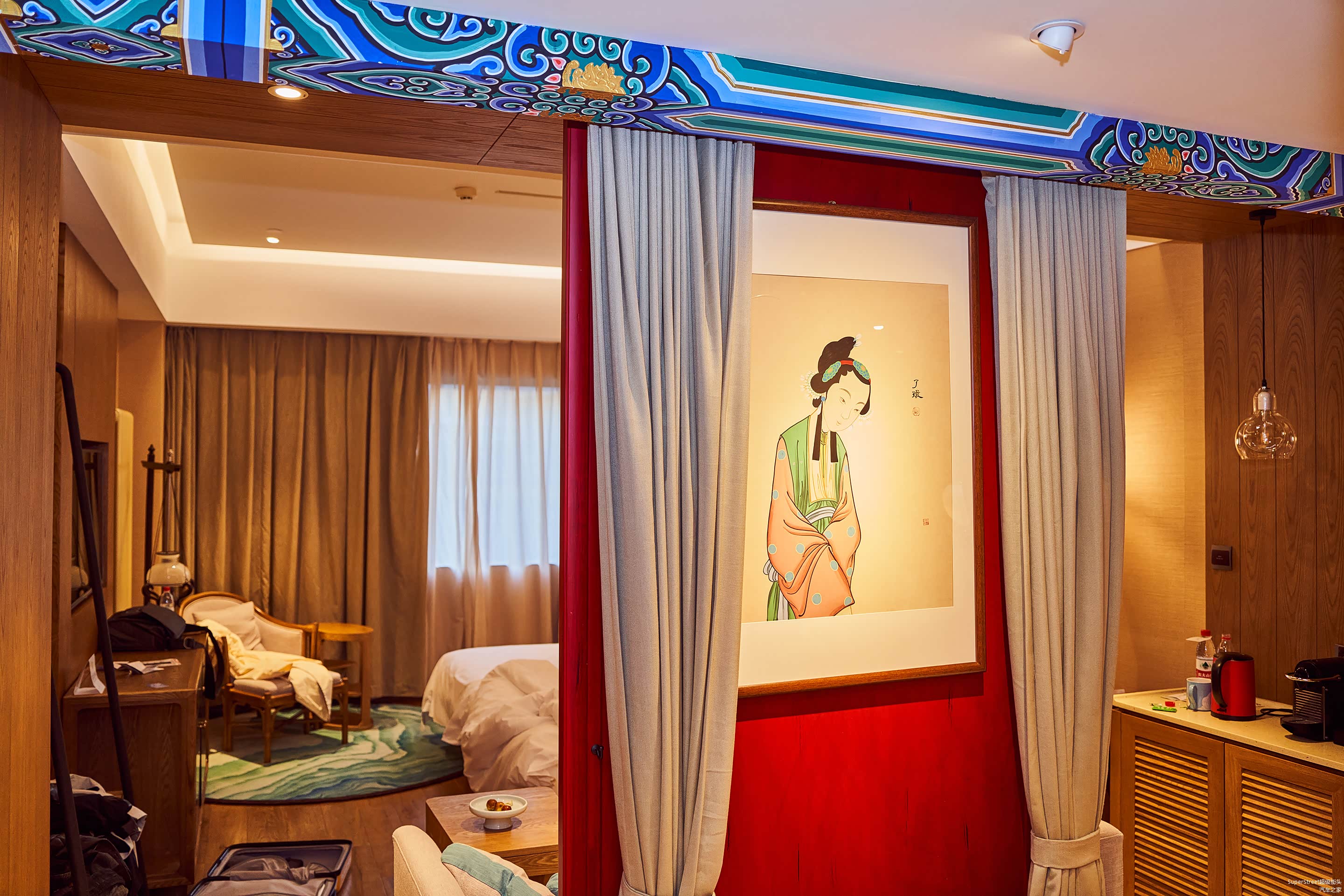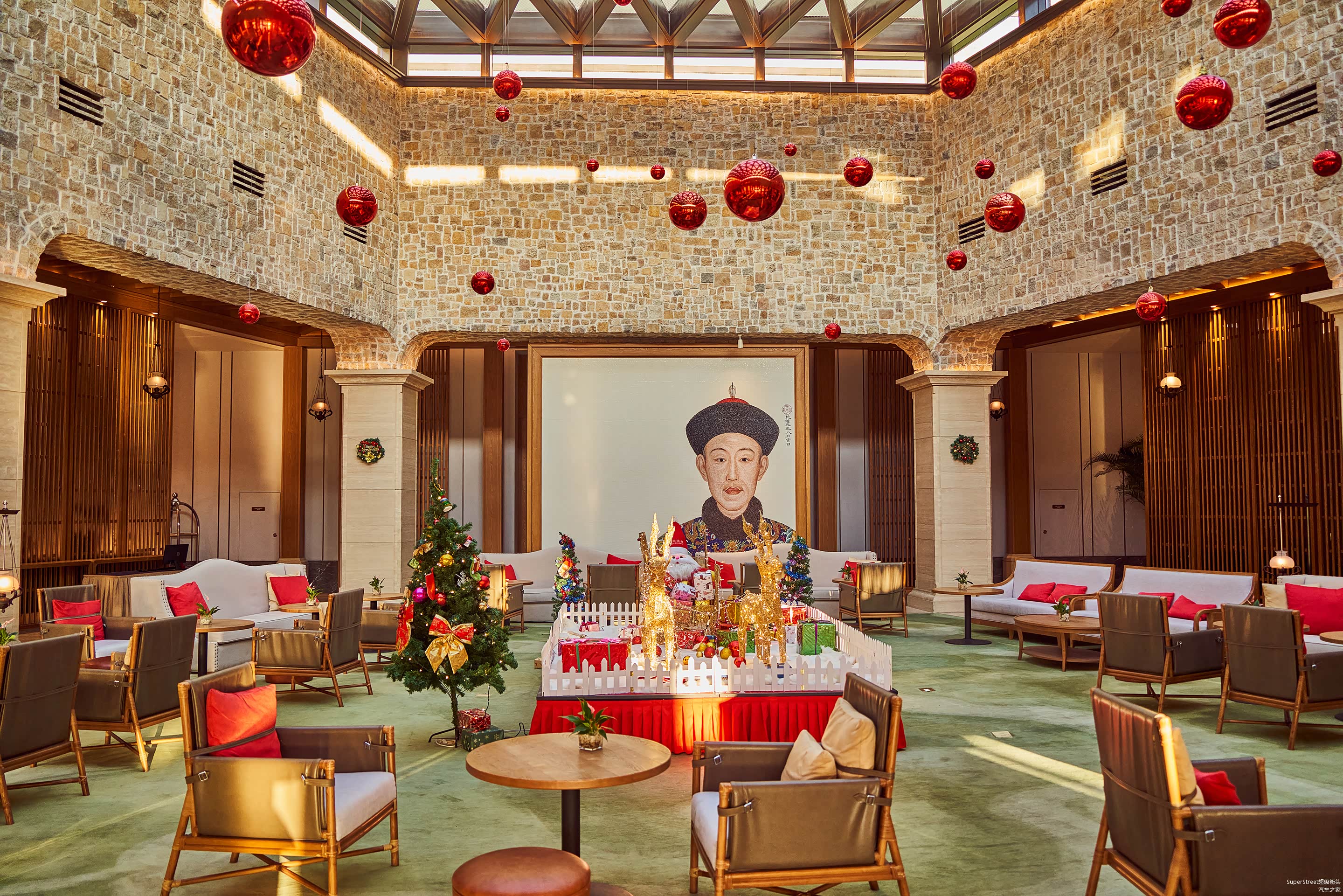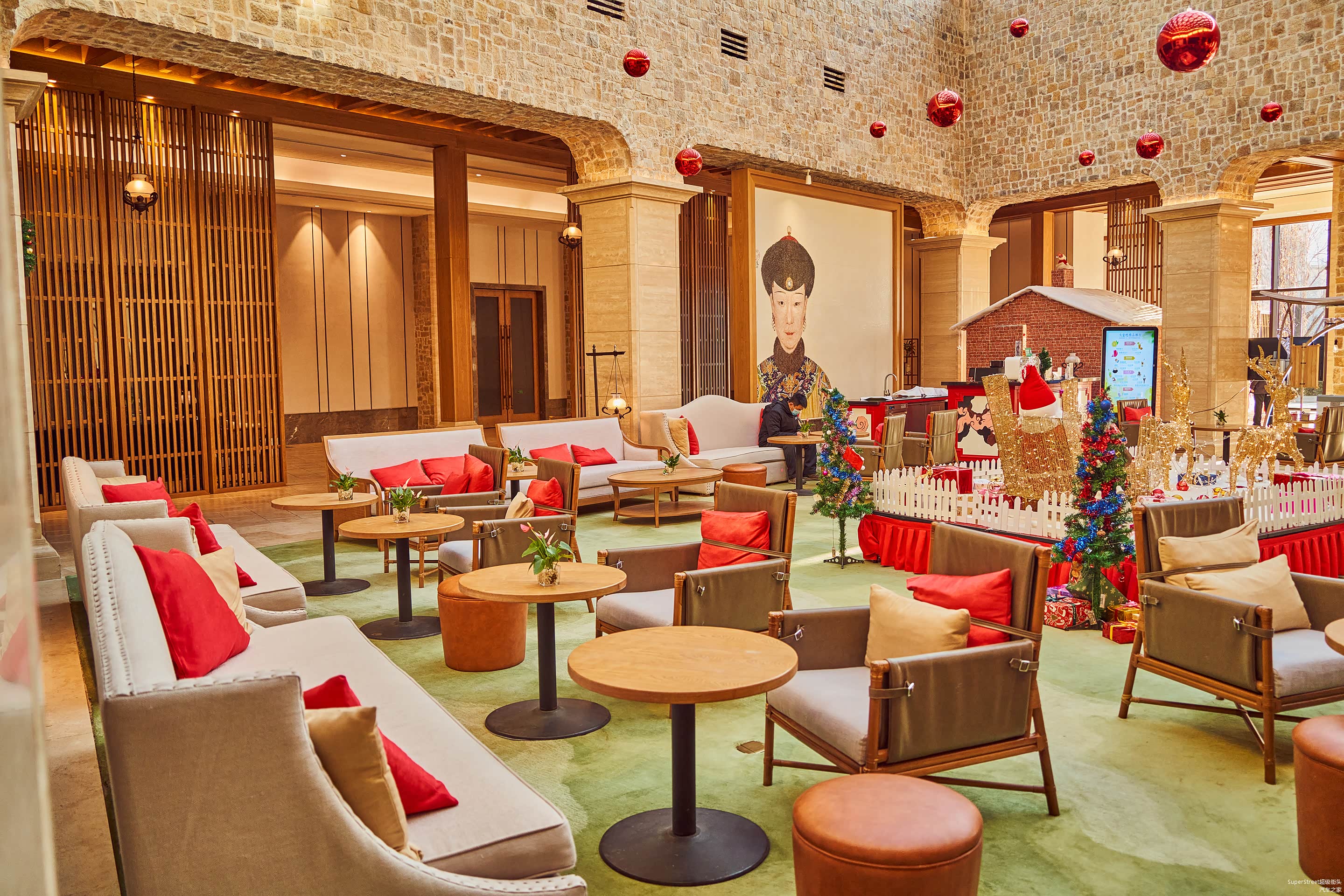 进入古北水镇后,入住古北之光温泉酒店,大堂的休息区虽然没有奢华高端的感受,看起来也还是很舒适休闲的,看到屏风上乾隆皇帝的画像,以此来彰显当年乾隆皇帝也来此游玩度假。