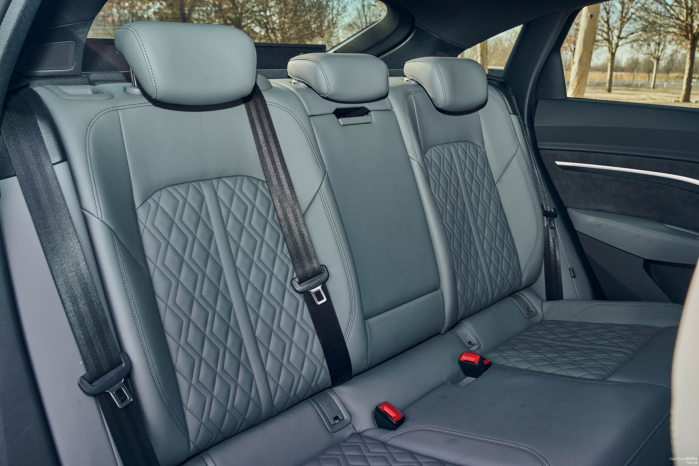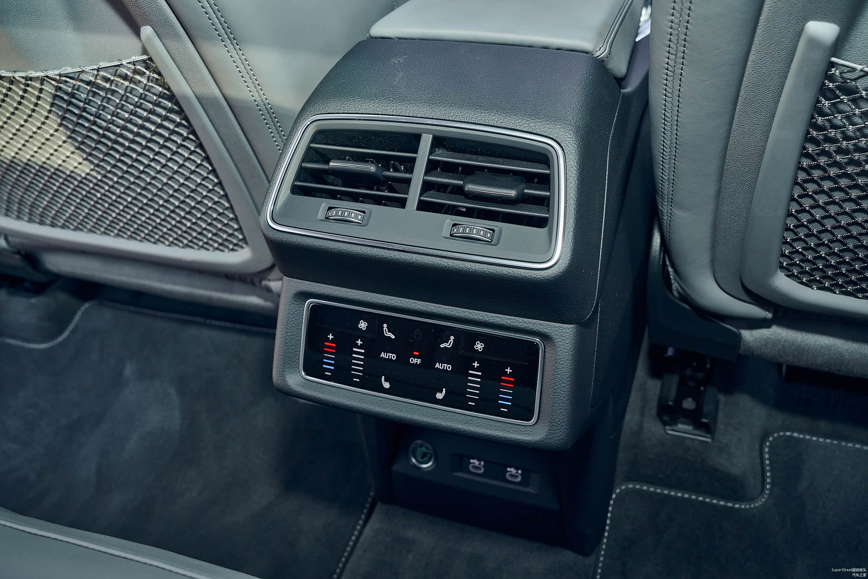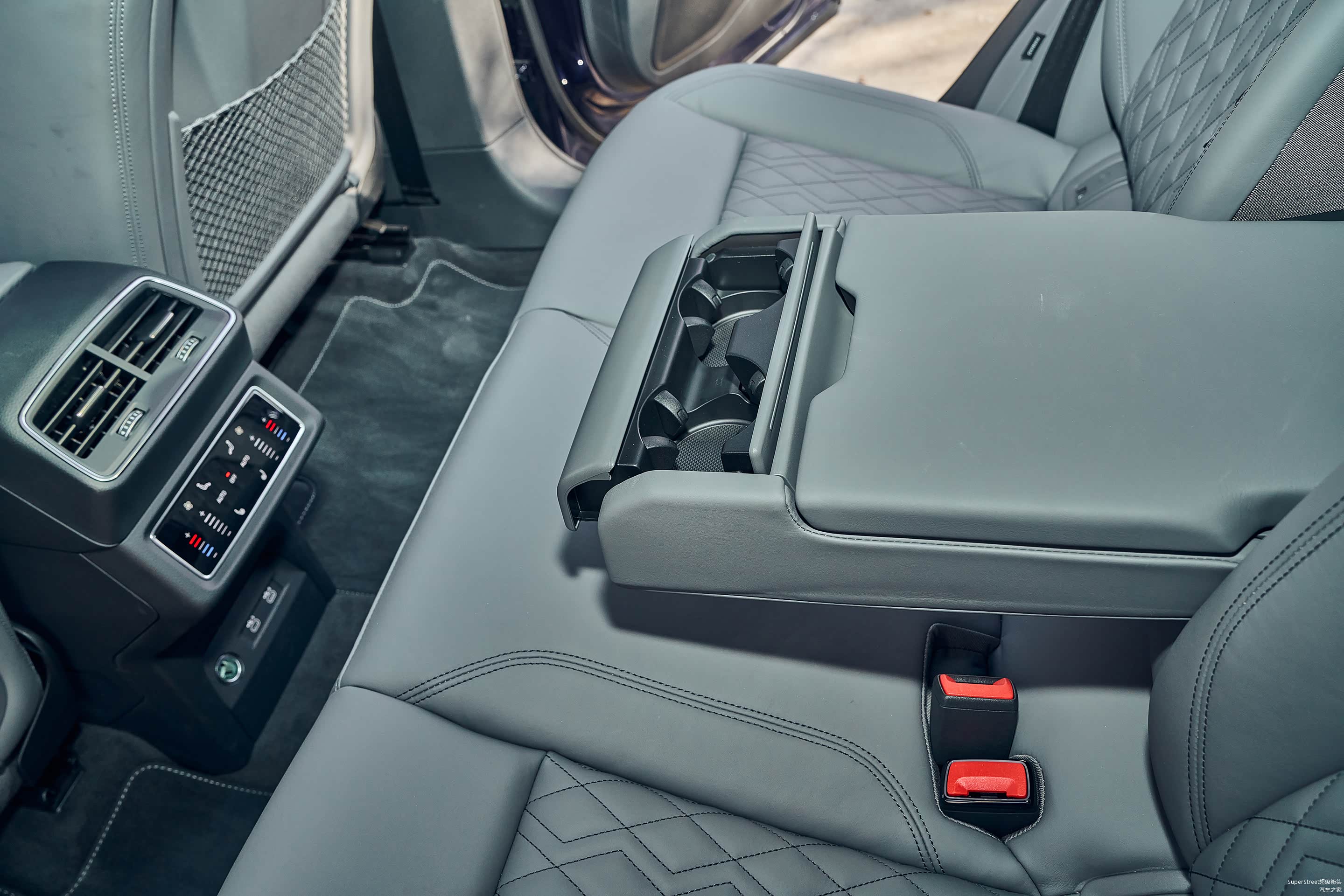 来到后排,最吸引注目的是中间的液晶屏幕,左右分区调节的空调,可以单独设置温度和风量,还有座椅加热功能。2928mm的轴距,可以更舒适地伸展腿部,只是后排中间扶手的杯架有些浅,一瓶矿泉水并不能保持得很稳固。另外,后排安全带提醒功能是我喜欢的。