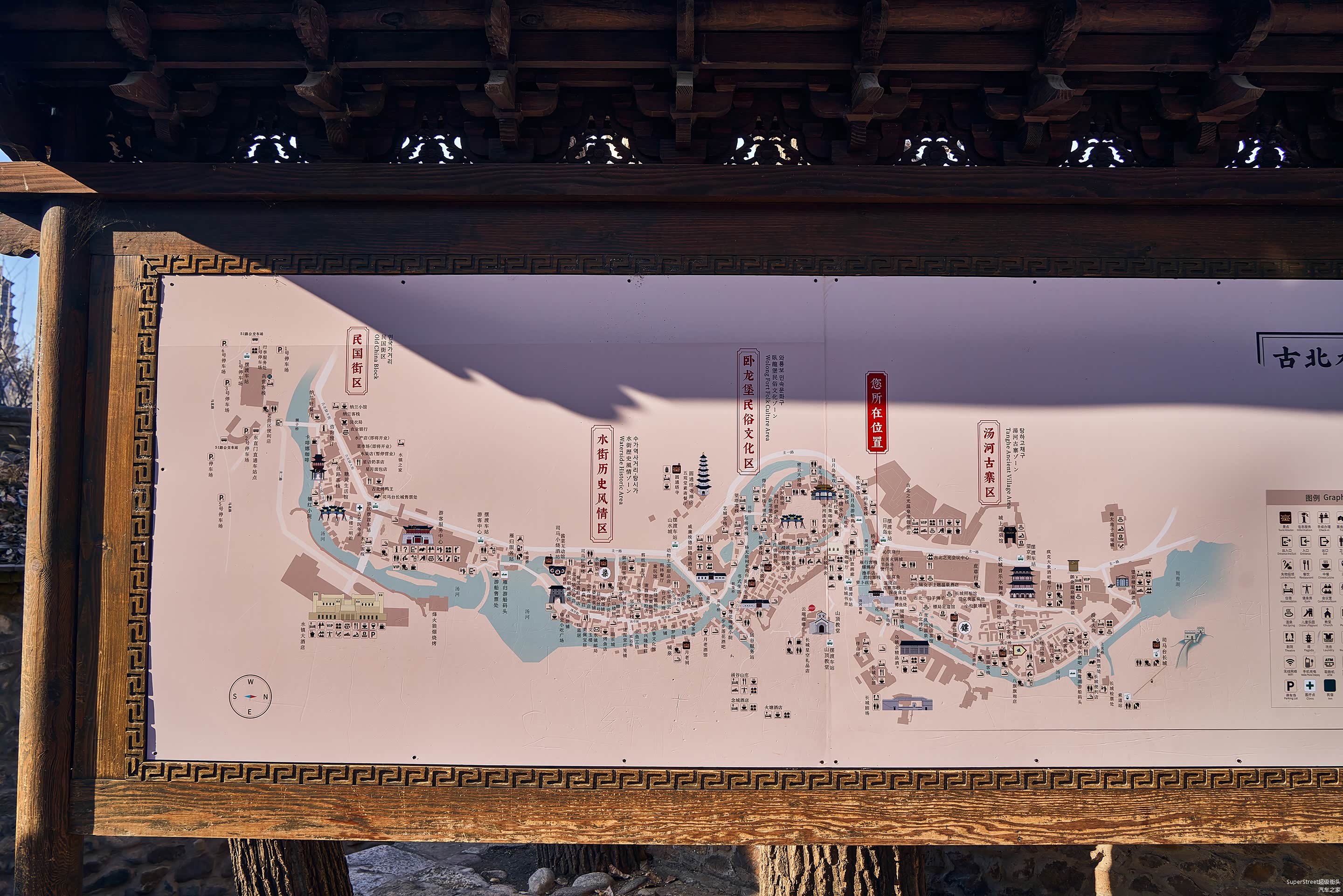 看了看古镇的地图,规划得非常丰富,民国街区、水街历史风情区、卧龙堡民宿文化区、汤河古寨区,高端的温泉酒店,特色的客栈,各色商家,各种店铺,应有尽有。