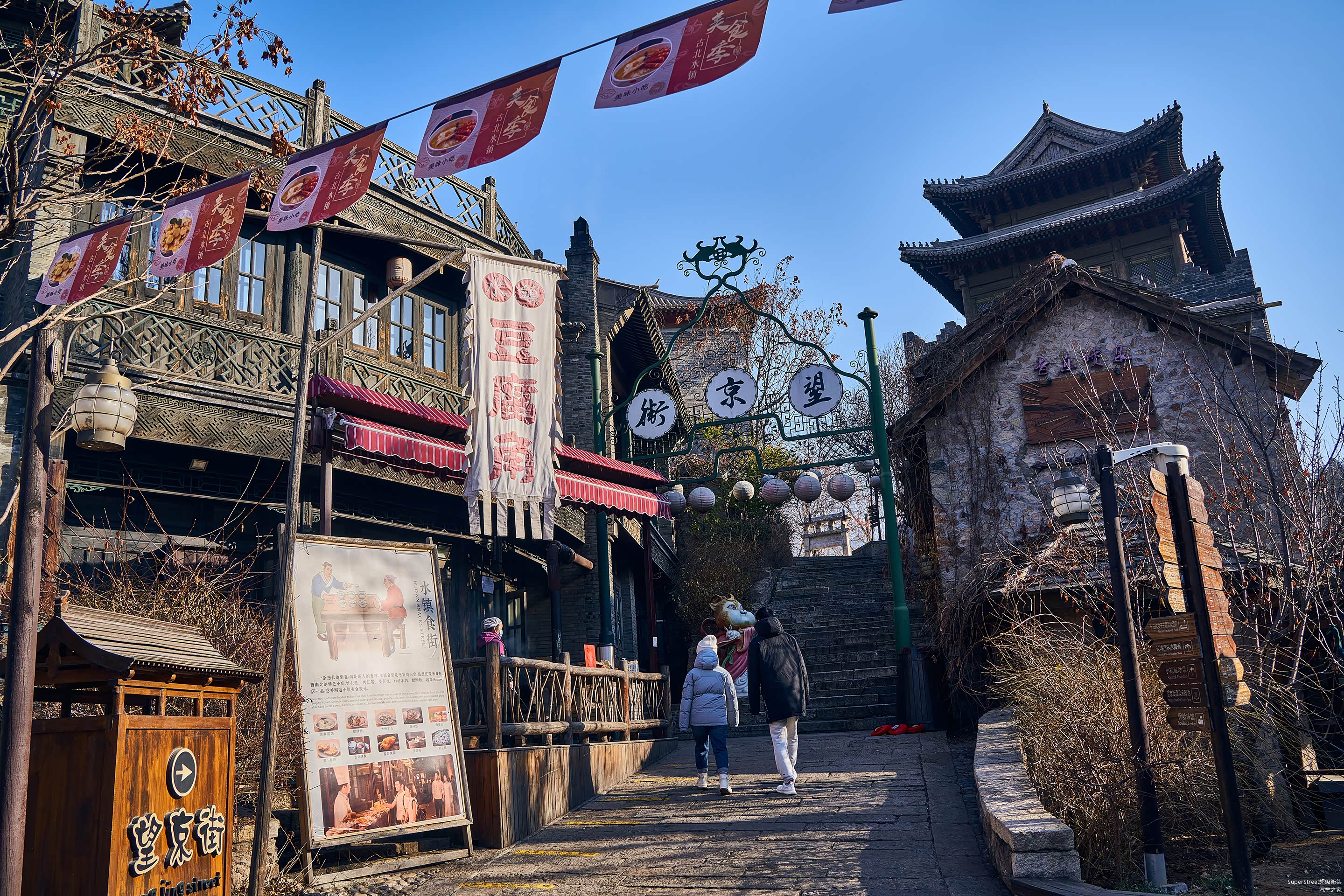 来到花木栏这里的商店,也基本到了水镇的中心区域,可以看到汤河古寨的牌楼,前边的望京街就到了镇子出口了,周边还有售卖萝卜丝饼等当地特色小吃。