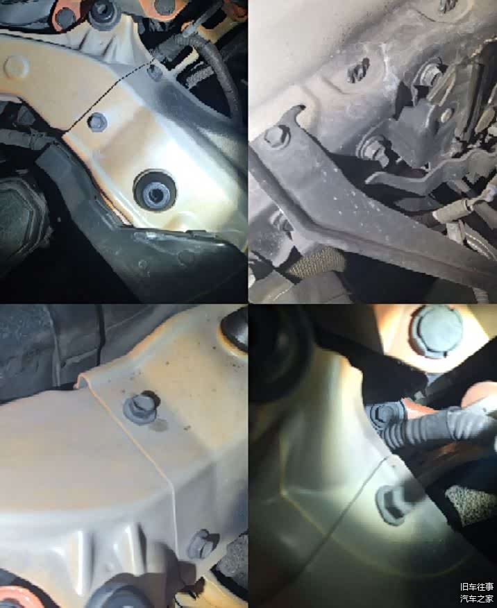 接着检测到元宝梁螺丝没有拆卸,我们可以排除发动机变速箱有吊装的可能性,从底部我们也可以看到左右纵梁是没有扭曲变形和修复的痕迹,可以进一步排除车辆存在重大碰撞事故。