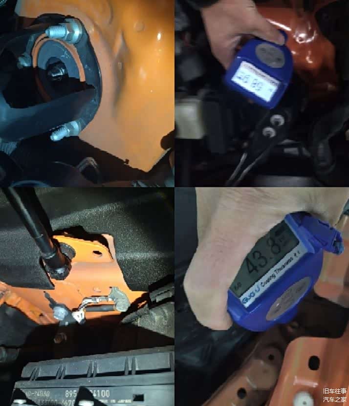 还好,右C柱内侧未发现切割痕迹,底边梁内侧也未见明显异常,A柱漆面数值正常,未发现异常。看来只是简单的擦挂引起的钣金喷漆,问题不大,下面来检查发动机的情况如何。