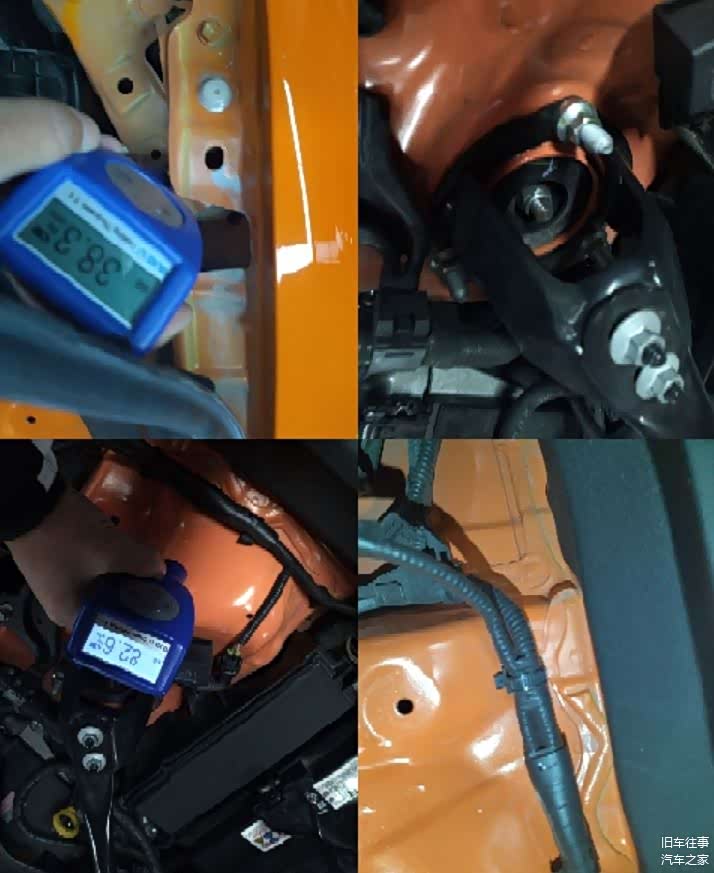 再来看看左前骨架,翼子板加强梁和避震包焊点正常,漆面数值正常,避震螺丝未见拆卸,可以排除有事故撞击的可能性。