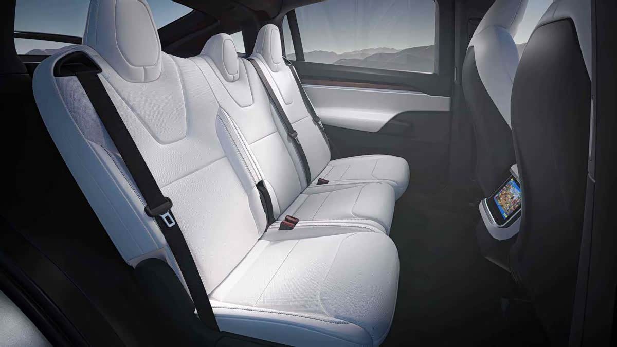 其它配置方面,车舱使用方面,Model X前排采用可自动开合、电动吸合无框车门,并支持无钥匙进入,尾部为电动尾门、车顶为透光玻璃车顶,并没有匹配天窗。舱内带有主动降噪系统、多区自动热泵空调与后隐私玻璃来优化舒适性,座椅则为电动调节运动座椅,前排带加热/通风、后排带加热,并可选三排6座或7座布局。另外,车辆后排也提供了独立的液晶屏,其同样可支持在线游戏等功能。