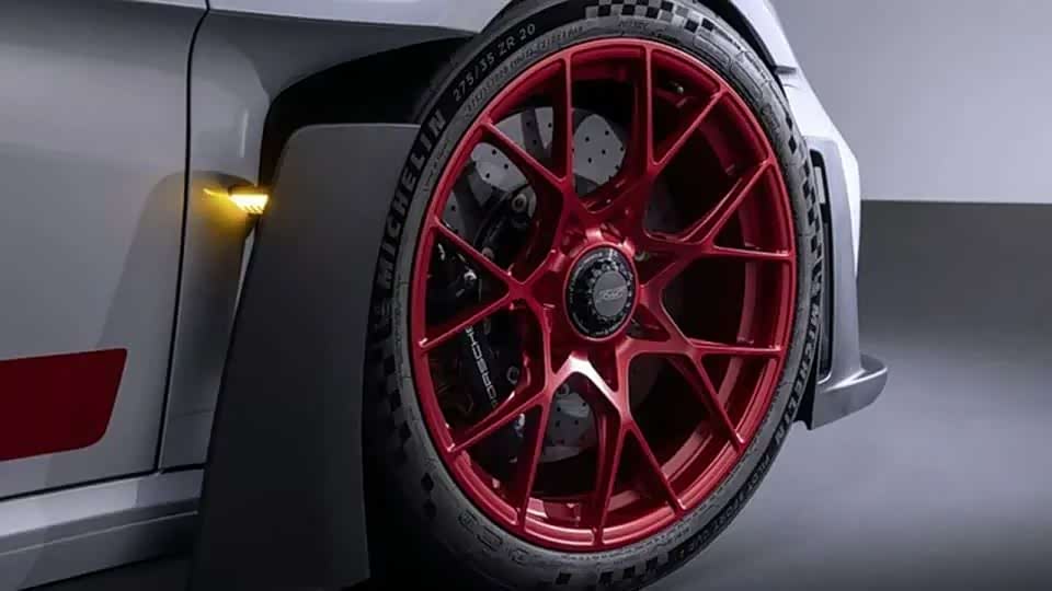 后翼子板也得到了进一步加宽,并配备了双七辐式的锻造轮圈,搭配米其林Pilot Sport CUP2高性能轮胎,碳陶制动系统也当然是不会缺席的。另外,车门后侧相比GT3 车型增加了进气口,可以为引擎舱提供更多的新鲜空气。