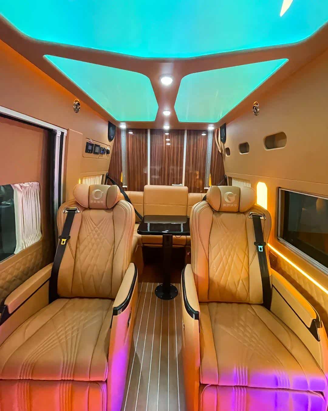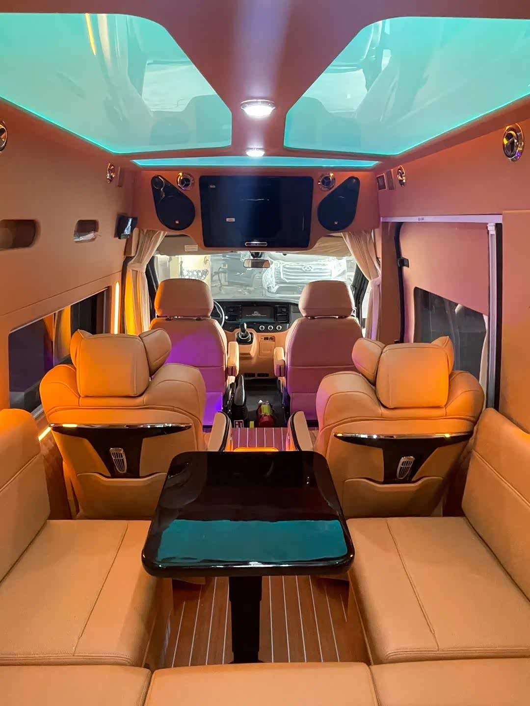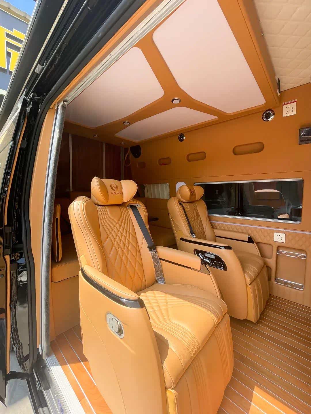 内饰布局清晰,从前到后依次为驾驶室、会客区,尾部为厨房区、卫生间。内饰采用游艇柚木地板,为车主带来高品质的旅居生活环境,再搭配顶部的LED氛围灯光,塑造奢华氛围。