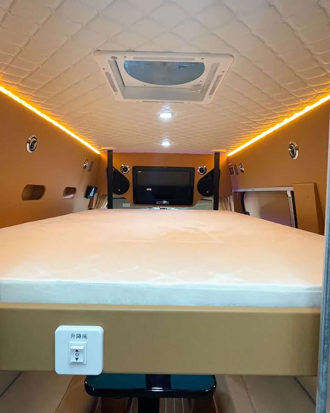 会客区上方还配有电动双人床,为内部额外拓展出休息空间,而且不用的时候收起也不占用内部空间,这对于内部较为紧凑的B型房车来说是一个十分巧妙的设计。床铺侧方还设计有小储物收纳格,可用来放置细碎的日用生活物品。