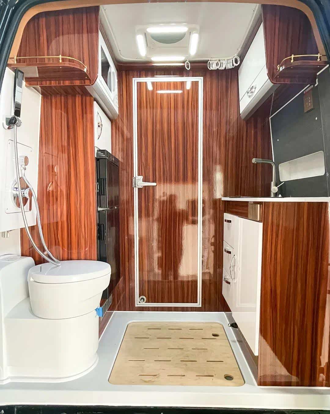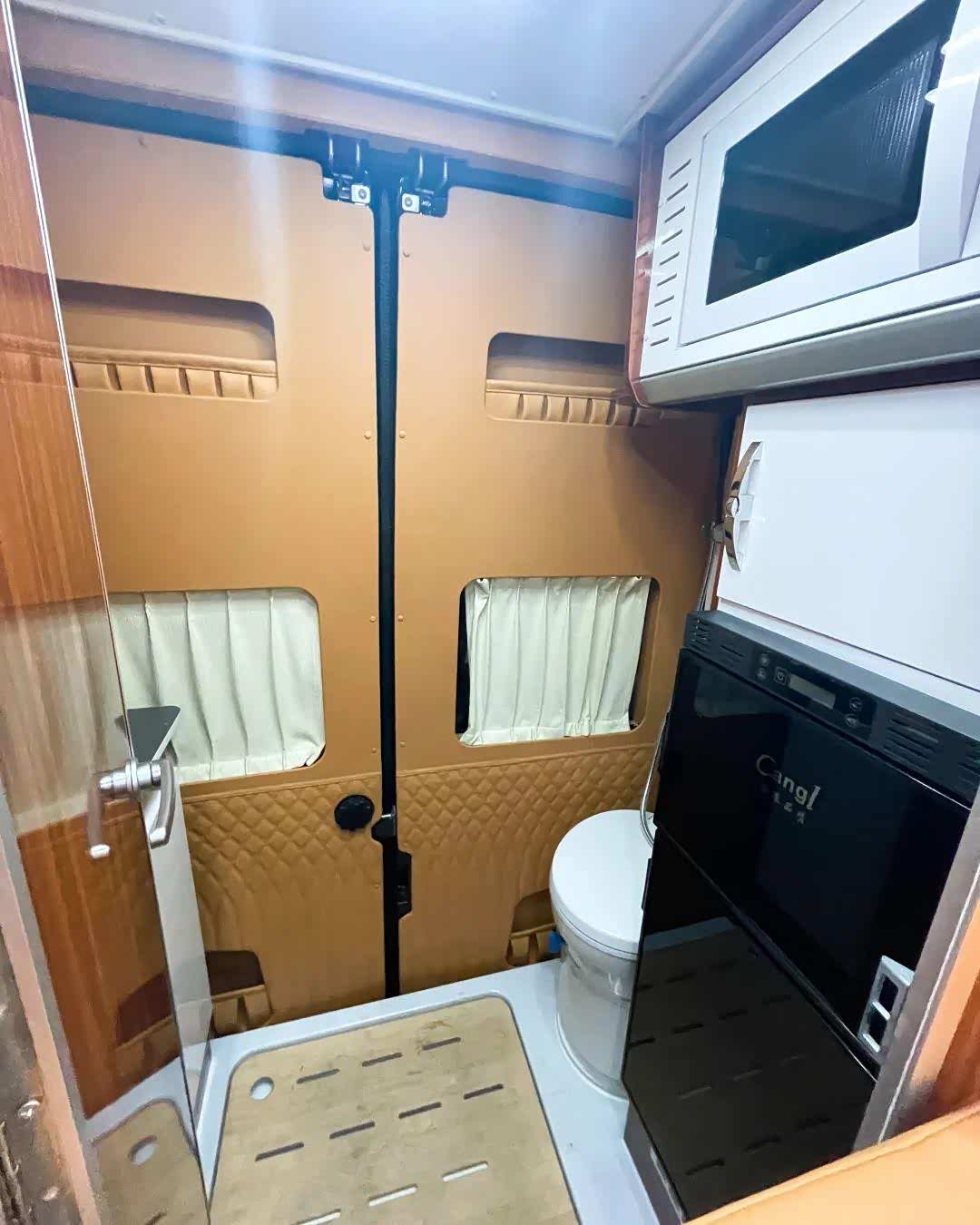 卫生间区域配有换气扇、房车专用电动粉碎马桶、梳妆镜、毛巾架、卫浴照明灯、房车专用淋浴花洒等,设施齐全。一体式地池+防滑垫木的设计为车主带来更加放心安全的洗漱体验。