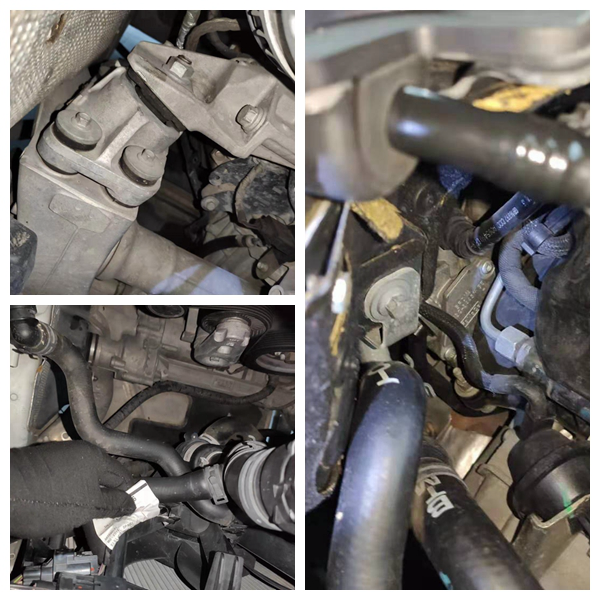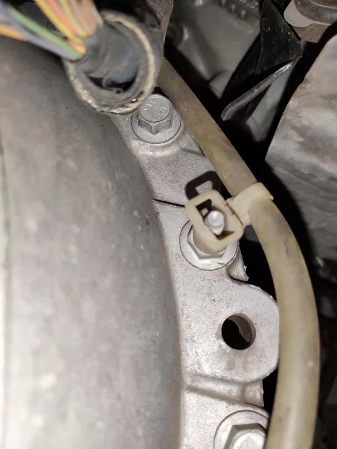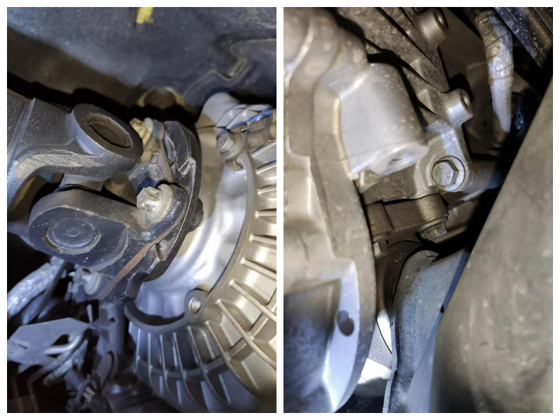 检查前副车架的螺丝,没有发现拆卸拧动的痕迹。不过变速箱托架有拆卸情况,拆托架就很有可能拆卸变速箱,来看看究竟!