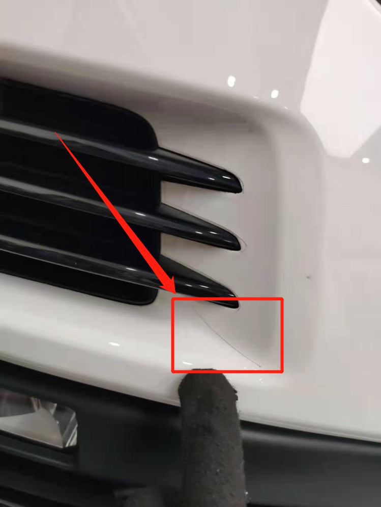 绕车观察一圈,发现全车贴有车衣,车身外观没有大的瑕疵,车衣可以保护原车漆面增加亮度,还可以修复一些小的剐蹭。仔细观察,在保险杠边缘处发现了喷漆的痕迹,并且保险杠边缘有一些毛刺,葫芦娃我判断前保险杠是后期更换的!
