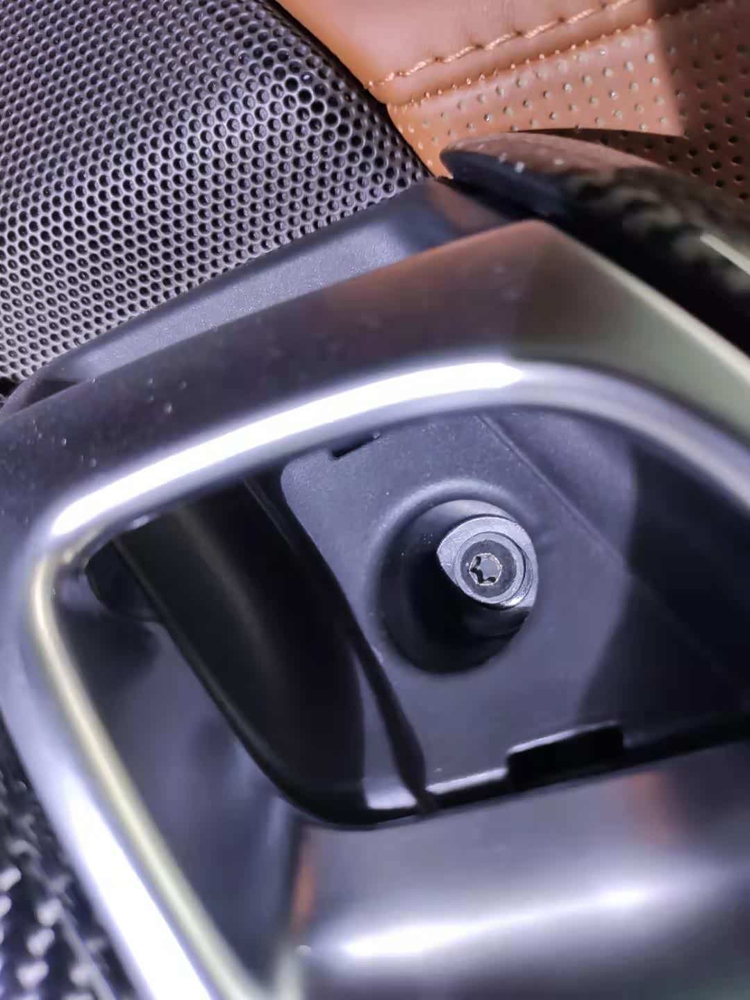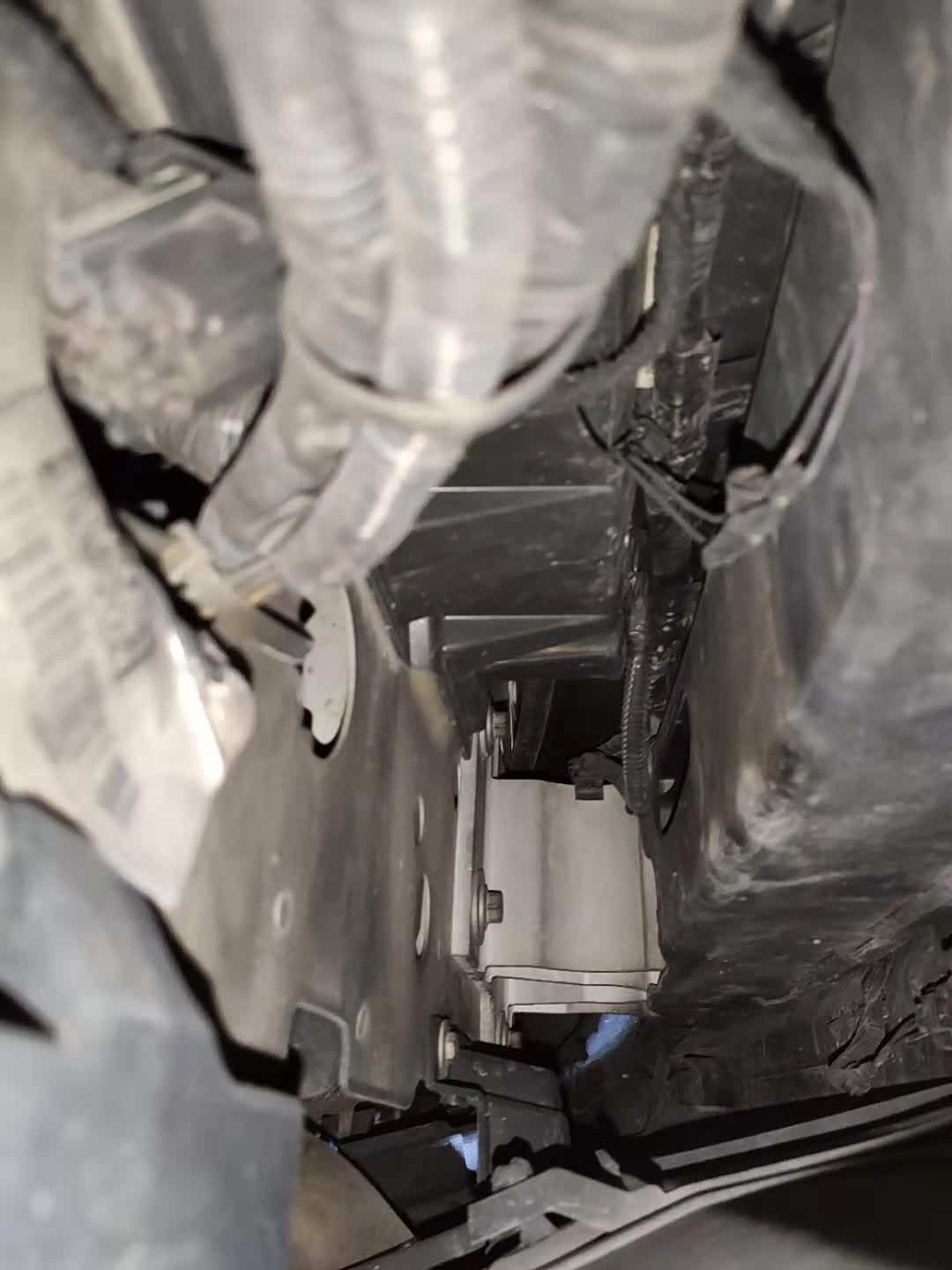 在后保险杠下部发现了一个方形的口子,并且像是人为的(这么关键的位置忘记拍照了,哭...)从这里向里观察发现后防撞梁有拆卸的痕迹,不过这车后面只有保险杠喷漆了,应该不是追尾造成的拆卸。