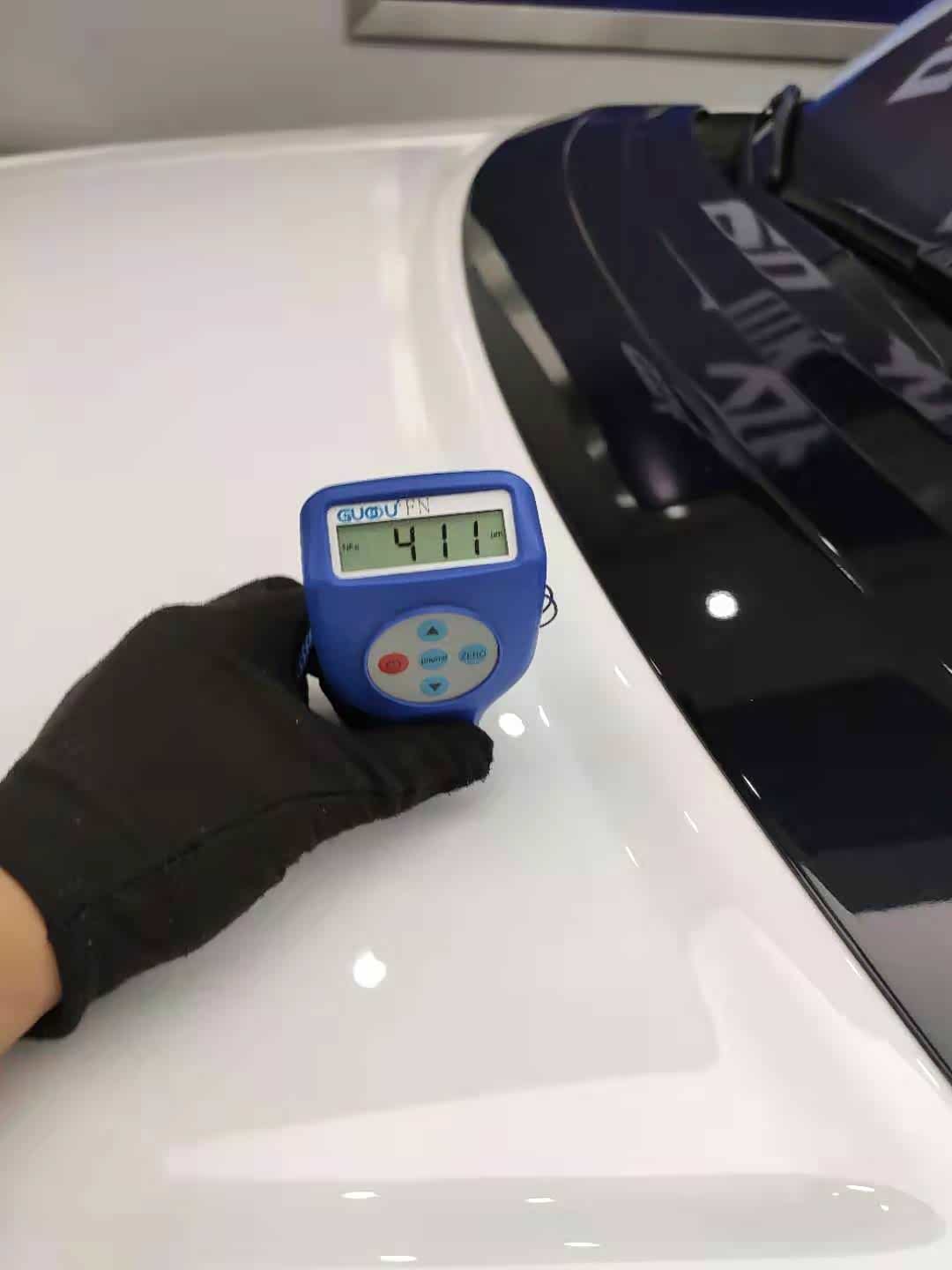 拿出仪器检查车身漆面,因为贴有车衣所以漆面数值偏高,暂时不知道原车漆面数值多少,需要继续检测对比其他部件的数值,来判断漆面是否正常。
