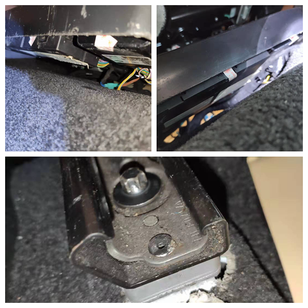 刹车踏板和方向管柱检查都没有问题,座椅有拆卸的痕迹,检查座椅底部的时候看到座椅下方的电脑板都有更换的情况,副驾驶座椅也是同样的情况,难道是泡水把座椅电脑板泡坏了?