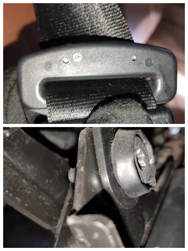 带着疑问继续往下检查,车内并没有发现泡水残留的泥沙和生锈迹象,但是后排座椅也有拆卸的情况,什么套路呢?检查安全带,生产日期没有问题,不过安全带螺丝有拆卸的情况,这个和拆座椅有关系,但是还要看看有没有其他的原因。