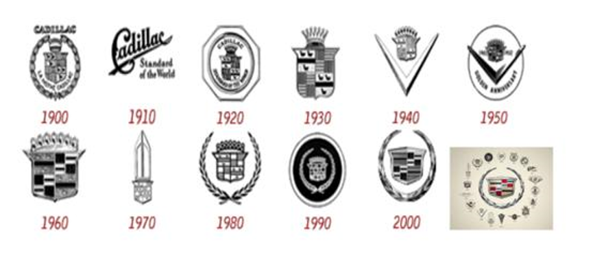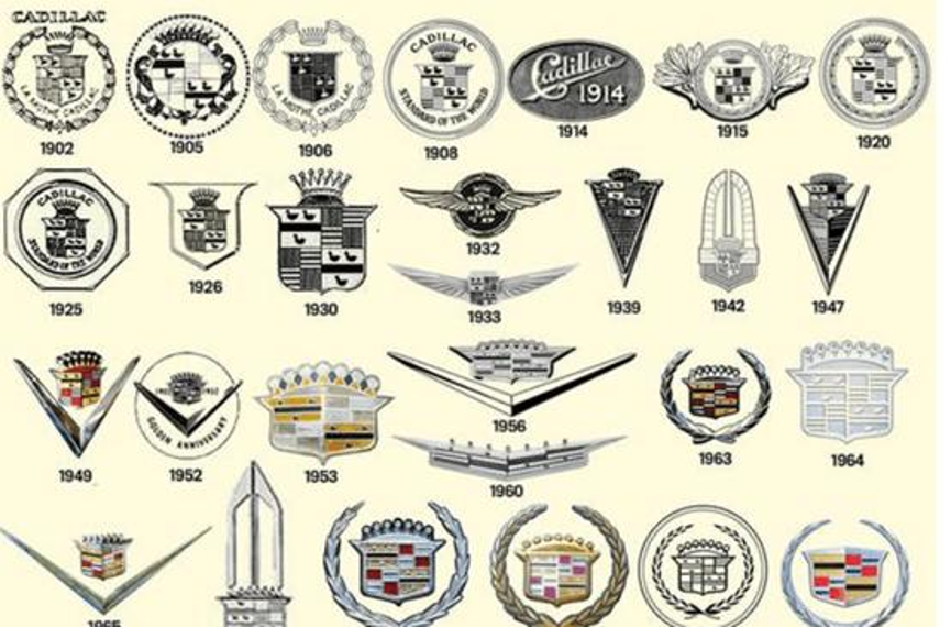 在此后的100多年的时间里,凯迪拉克的Logo更新次数多达38次,但基本都围绕着1906年的车标版本的而设计。花环、盾牌、王冠是被应用最多的元素。