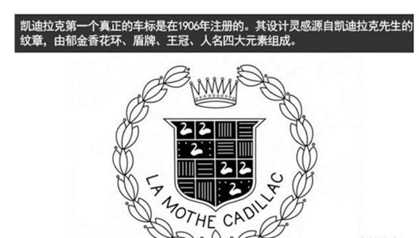 凯迪拉克第一个真正的车标是在1906年注册的,其设计灵感源自凯迪拉克先生的纹章,由郁金香花环、盾牌、王冠、人名四大元素组成。花环代表成就和荣耀,盾牌代表勇敢开拓和百折不挠,王冠则代表凯迪拉克在汽车行业中的贵族地位。此外,盾牌部分还融入了鸟形鸭和十字军战士的元素,寓意神圣、大胆、勇猛。