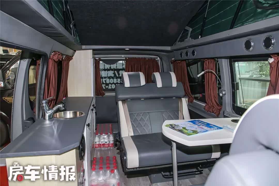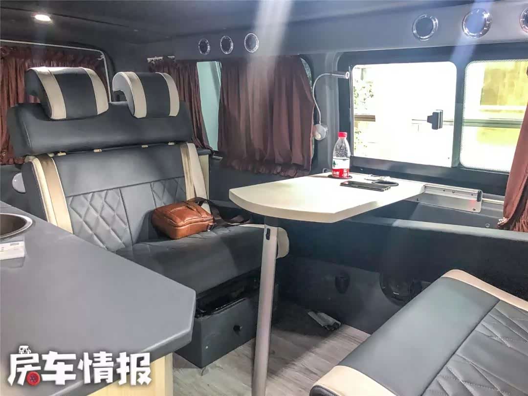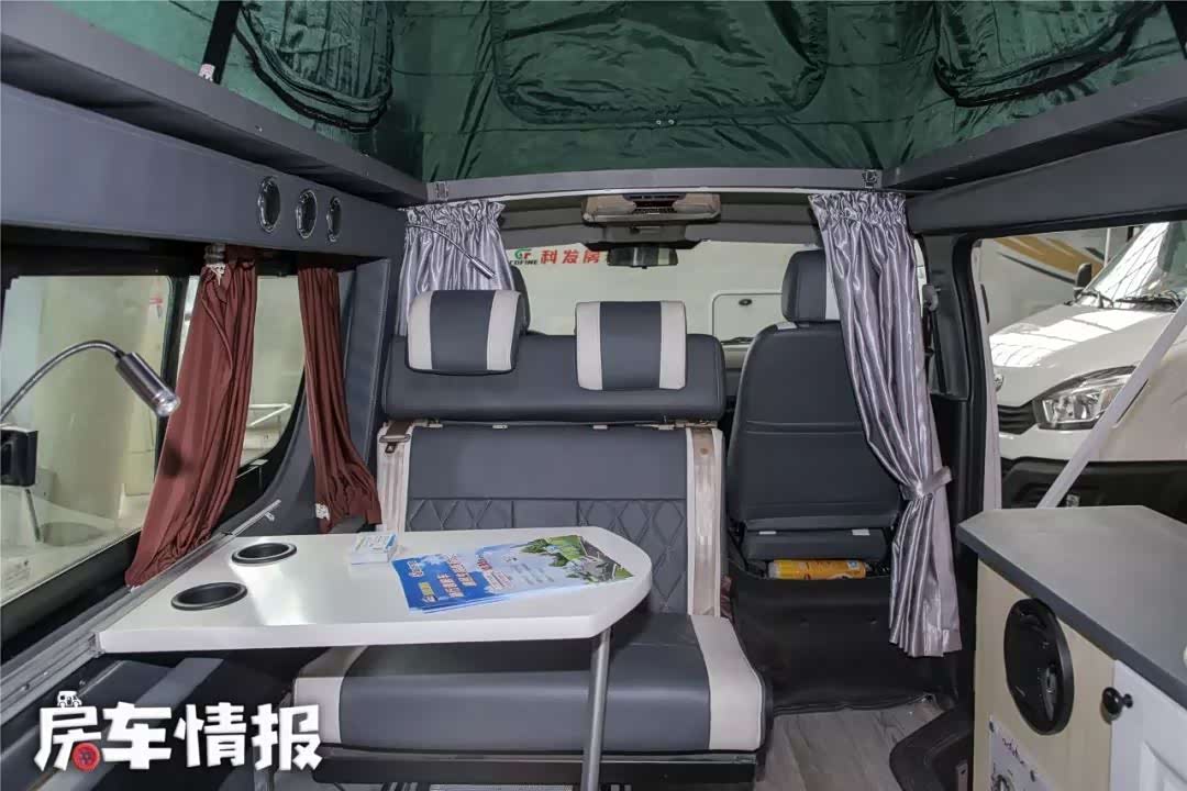 进入车厢内部,可以看到车内整体布局与常见的休旅车更相似,不大的空间里设有对坐座椅、厨房设备等,虽然比不上传统C型房车内部的大空间,但满足日常自驾游还是没问题的。