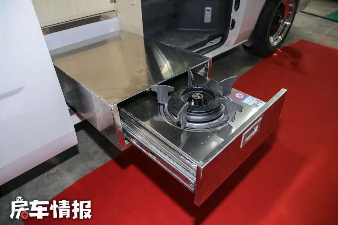 车上的燃气灶被设置于侧滑门外侧,使用时需打开侧滑门,将燃气灶抽出,在一定程度上可减少油烟对车内的污染,不过个人觉得这样的设计倒不如直接搭配一个便携式燃气灶,这样就可以像在哪儿做饭在哪儿做饭,完全不用担心油烟的问题。