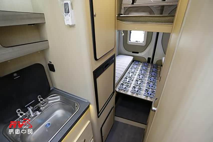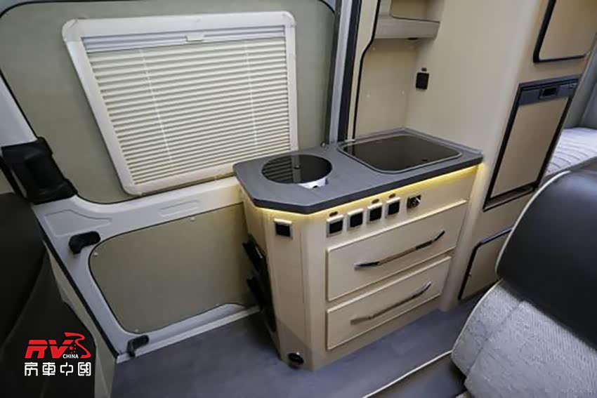 客厅的后面是车内的厨卫区域。厨房位于车辆中开门的左侧,一体式的橱柜设计,配有简单的电磁炉、洗水槽、储物柜、220V插座等,同时还安装有车内各电器设备的独立物理式开关按键,操作非常方面。49L的车载冰箱位于右侧的一体柜中间,上下均是储物柜,由此可以看出,还可以选择大容量冰箱。