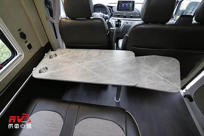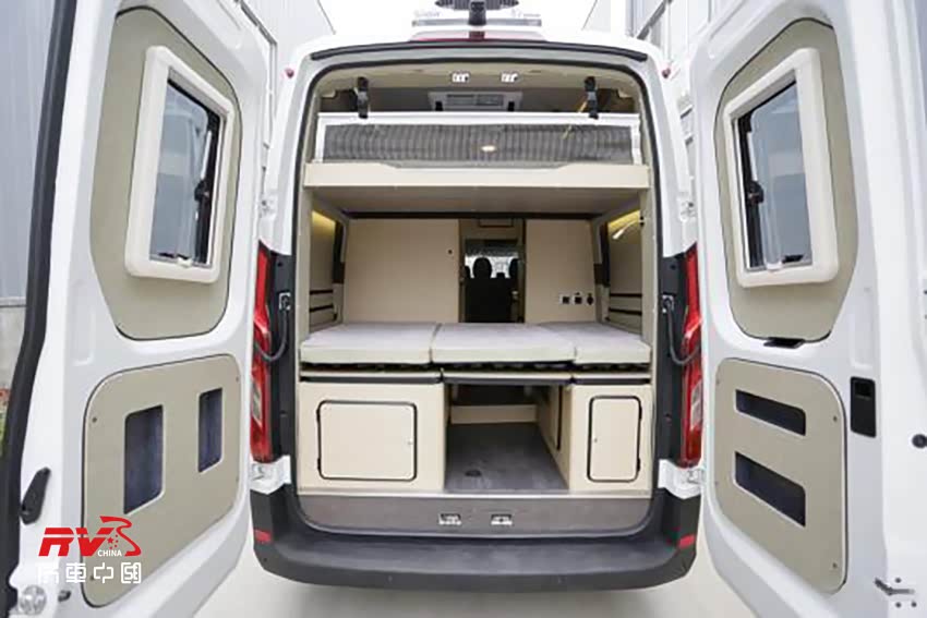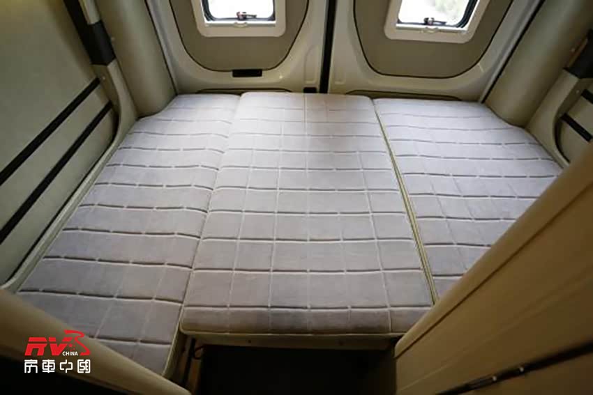 最后是车内的睡卧区域,横置双人床布局,还配有上方的吊床,所以,即使车辆乘坐5人,也能休息5人,桌板也可以沙发拼床。