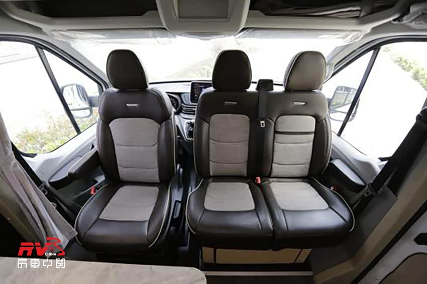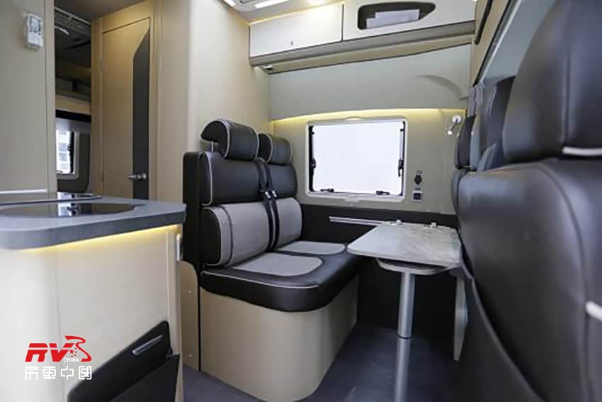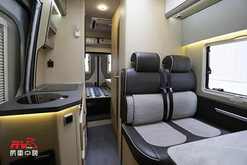 这款景晏房车的上汽大通RV90自行式B型房车内饰布局采用的是前面客厅(乘坐区域)、中间卫浴区域以及车尾部横床布局睡卧区,是B型房车中常见的布局方式。