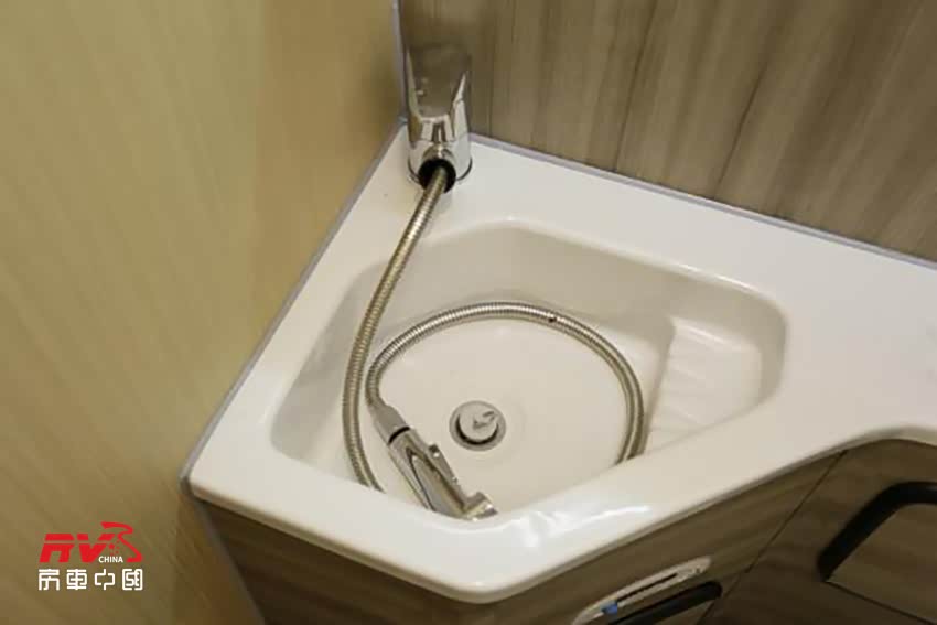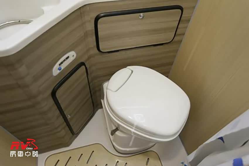 与其他的房车不同,这款房车在卫生间内做了立地的一组边柜,并设计了吸塑一体成型的洗水槽,非常的美观,也很适用。卫浴区域配有赛特福德盒式马桶、抽拉式水龙头、换气扇、通风窗等,日常注意保持卫生间干燥,就不用担心板子受潮了。