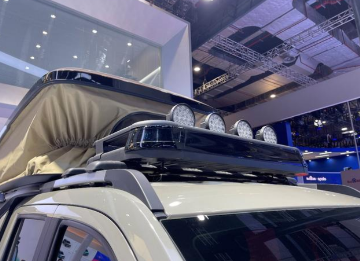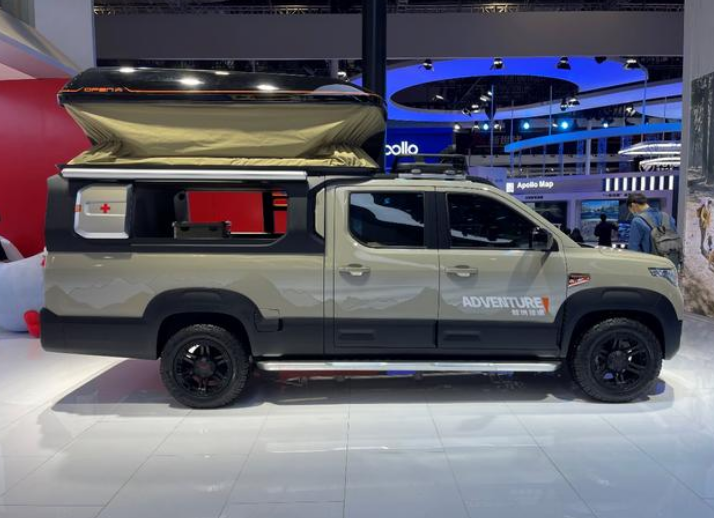 而在货厢顶部,"越境征途"则配备有野外露营帐篷,可为野外自驾游爱好者提供临时的休息场所。同时车顶帐篷的设计也相当精巧,利用电动升降系统即可将帐篷撑开,不需要用户额外动手,日常行车时收起也很方便。为方便用户上下帐篷,"越境征途"在车身左侧还配备了可收纳的折叠梯,车身右侧还有可伸缩遮阳帘,可最大限度满足露营爱好者的用车需求。