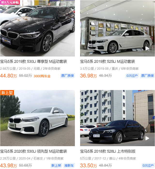 反观二手车市场的G38,目前整体行情在30-50万之间。其中,2017年全新5系上市时的首批车型,价格基本在30-35万的区间内。如果运气好的话,还能以34万左右的价格,买到搭载211马力2.0T发动机的528Li首发版,这也是二手国产5系中性价比最高的一个版本。毕竟搭载184马力的525Li,价格并不比528Li便宜,可动力却弱了不少。而252马力的530Li,目前二手车价格则大概集中在40万左右,性价比依然不高。