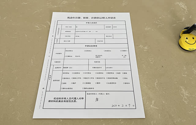 这张机动车注册、转移、注销登记/转入申请表,再加上验车时拍摄的那张照片,就是车辆行驶本制作的两项素材。