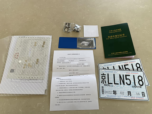 离开新车业务大厅前,你会拿到以上这些证件。包括新车的行驶本、机动车登记证书、最后一副临牌以及两套京字扣螺丝。还有机动车号牌邮寄委托书,上面明确写着铁牌到了后,你还需要支付20元的邮寄费给中国邮政。我只想说,中国邮政是不是就靠这个活着呢?