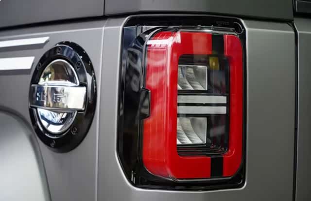 2022款BJ40环塔冠军版的尾部是经典的“方盒子”造型,大尺寸后窗采用的是外掀式的方式,全尺寸备胎使用的是常见的外挂式设计。下包围设计粗壮且线条有棱有角,造型与前脸相呼应。
