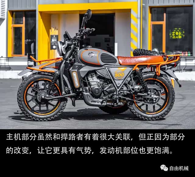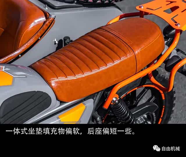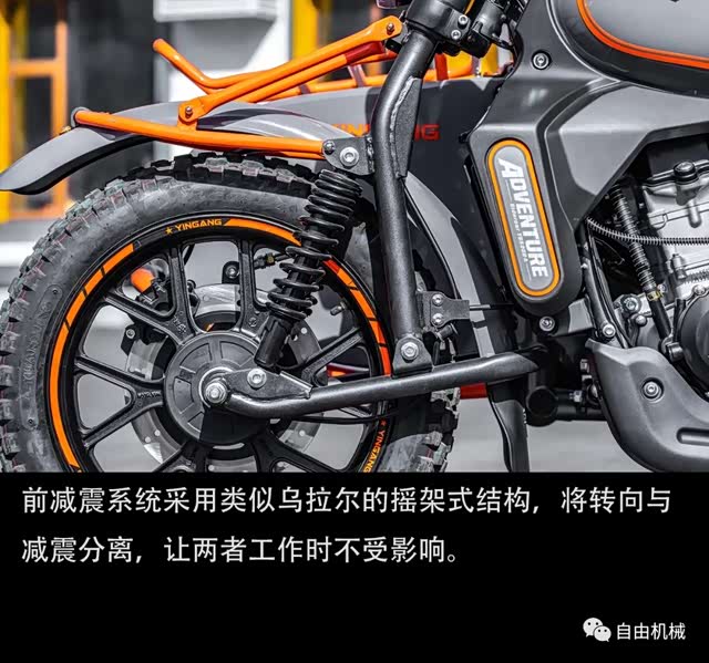 和乌拉尔极其接近的摇架式前避震,理论上来讲把转向和滤震分开是好事,但前减震的阻尼设定偏硬,颠簸的路感还是很清晰,加之越野胎的不平整,低速时传递到手和坐垫的震感比较影响舒适性。未来量产版再调软一些将更完美,或者增加一款公路轮胎版本。