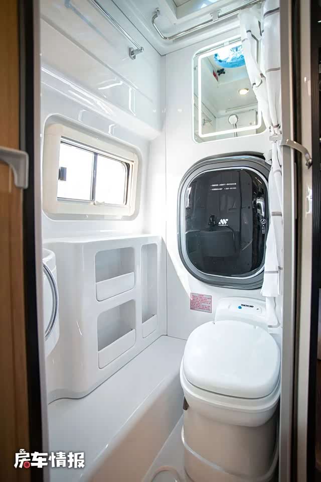 作为一款标准的B型房车,厨房区后方的卫生间内部空间还是很让人惊喜的,整体使用了一体吸塑式的设计,可以更好防潮防水以延长整体的使用寿命,另外还配置了可旋转的盒式马桶、独立的淋浴花洒、带有LED灯的梳妆镜、洗手台盆和3kg洗烘一体机,日常的基础洗漱需求都可以满足。