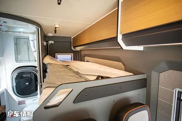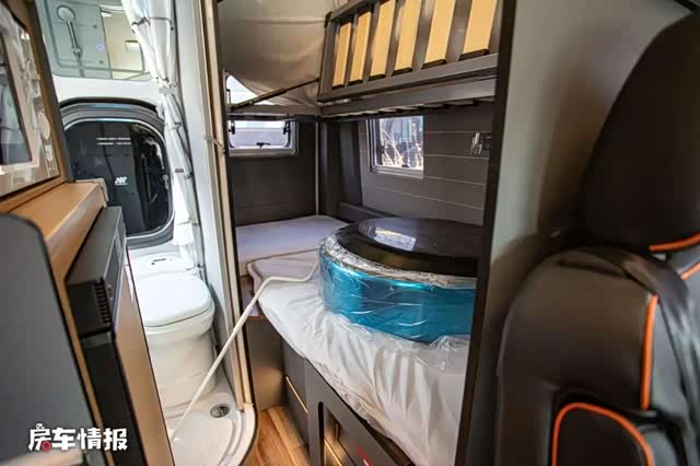 因为卫生间空间的扩大,所以车内的休息区采用的是上下单人床的设计,上铺尺寸为2000*800mm,下铺尺寸为1950*900mm,分别可以容纳一名成年人使用。