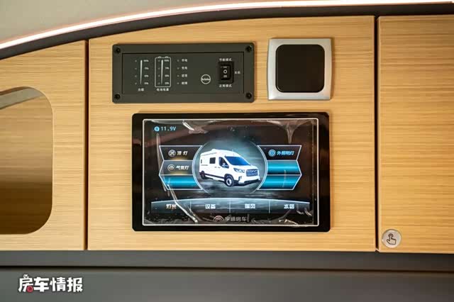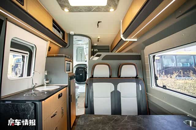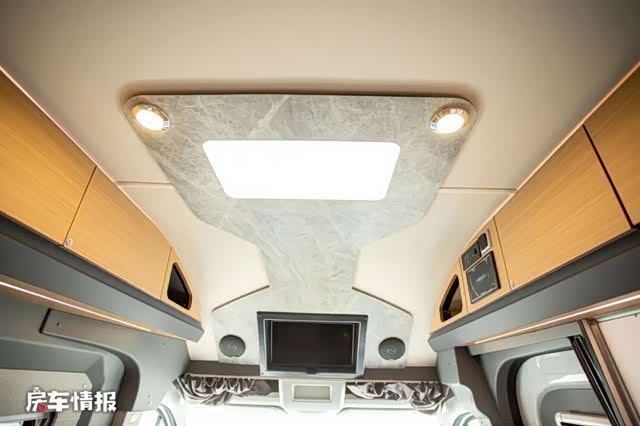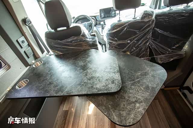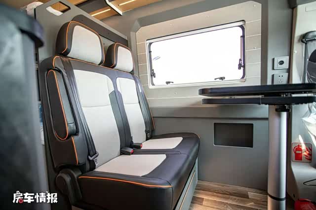 会客区采用双人连排座椅+升降可拓展餐桌的设计,座椅也都采用了乘用车级别的设计,为日后的乘坐提供了更多的舒适性,搭配驾驶室顶部的19寸液晶电视,也能享受更惬意的旅居生活,到了晚上有临时应急的住宿需求时,也可以变为一张小型的沙发床使用。