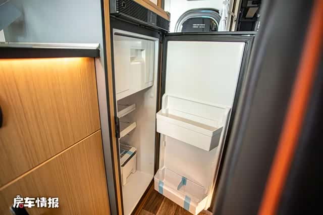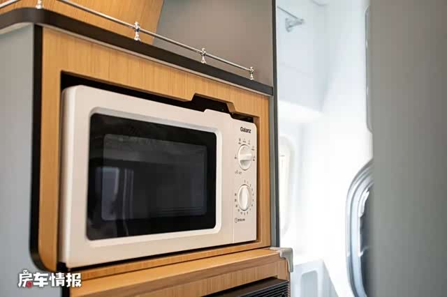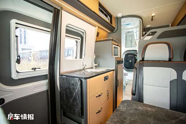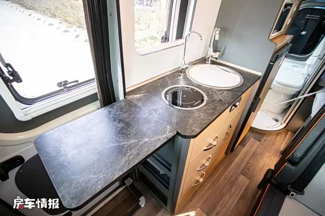 位于乘客门处的厨房区域还是保留了基础款车型的设计,采用高低台面的设计,最前方是基础的操作台,侧面带有拓展备菜区,台面上带有电磁炉和不锈钢水槽,同时提供直饮水,后方则是微波炉和一台90L的冰箱。