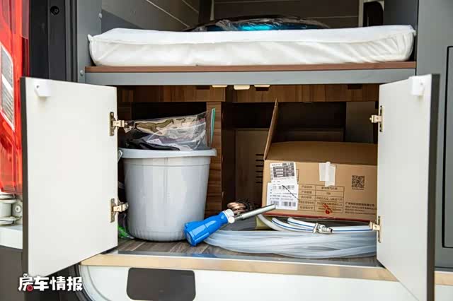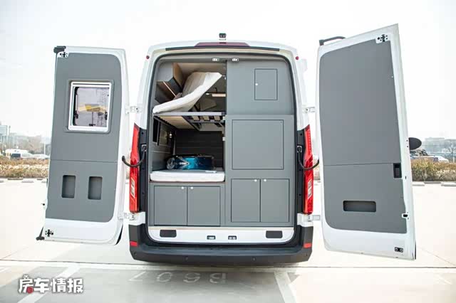 打开车厢的后尾门可以看到床铺的下方还带有基础的储物空间,以满足日常存放行李的需求。