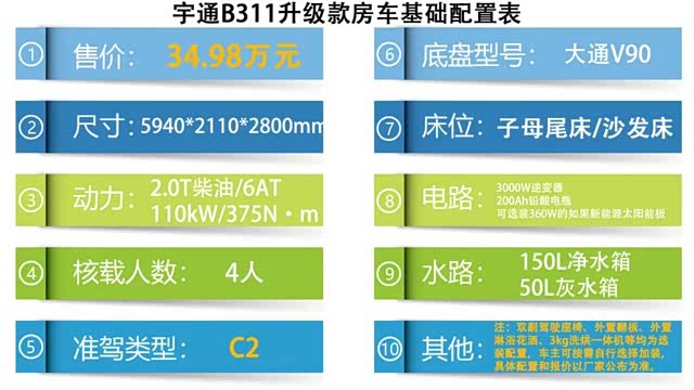 这款搭载大通V90底盘,升级了多处配置的升级款宇通B311房车,现在的售价为34.98万元,(注:上述配置中,包括双副驾驶座椅、外置翻板、外置淋浴花洒、3kg洗烘一体机等均为选装配置,车主可按需自行选择加装,具体配置和报价以厂家公布为准。)不知道对于这款升级版的车型,您觉得如何呢?欢迎在下方的评论区和我们分享,下期再见~