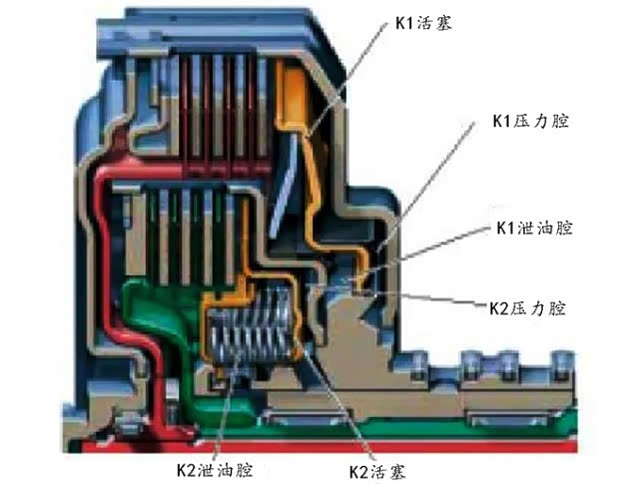 而湿式双离合器采用一大一小2组同轴安装在一起的多片式离合器,因两个多片离合器组件始终浸在油液中,故称湿式双离合器。