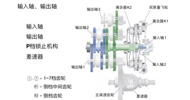 以DQ200 7速干式双离合为例,下图是DQ200的结构简图。