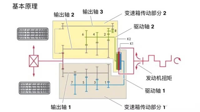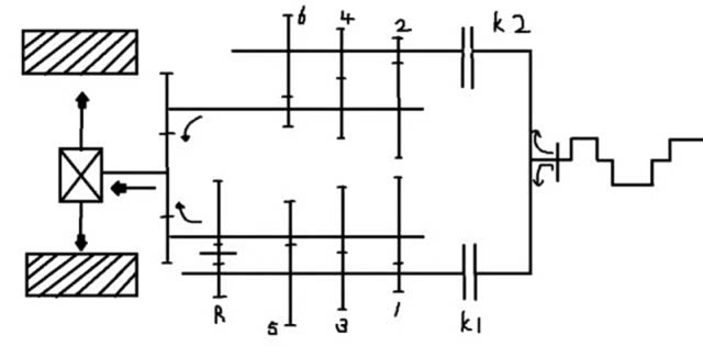 离合器K1负责1、3、5、7奇数挡位;离合器K2负责2、4、6偶数挡位以及倒挡,当离合器K1结合的时候,驱动轴1与1挡、3挡、5挡、7挡主动轴连成一体,此时发动机的转通过驱动轴1,使得与其连成一体的1挡、3挡、5挡、7挡齿轮主动旋转。
