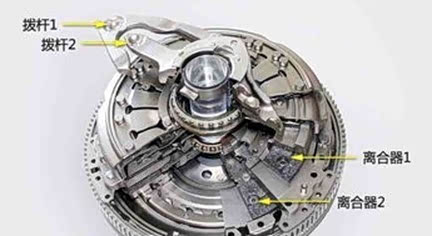干式双离合器由两个尺寸相近的膜片式离合器片同轴相叠安装组成。位于两侧的2个离合器片分别联接1、3、5、7挡和2、4、6挡以及倒挡齿轮,中间盘在其间移动,分别与2个离合器片“结合”或“分离”,通过切换来进行换挡。