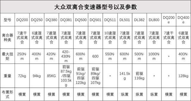目前国内在售的大众车型所搭载的DSG变速器型号入下: