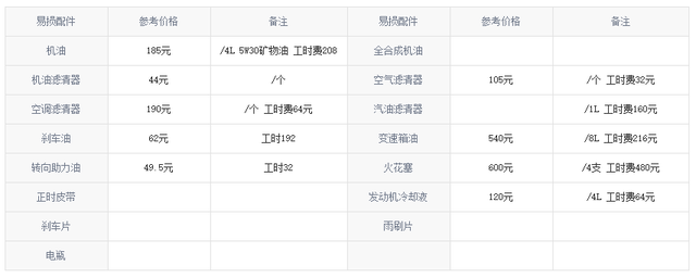 从配件价格来看,5W-30矿物质油价格在185元/4L,价格上不贵,这也是保养周期短的原因,但工时费不便宜,达到了208元,机油滤清器在44元,和机油一起更换免工时费。空气滤清器在105元,工时费在32元。空调滤清器在190元,工时费在64元。刹车油在62元,工时费在192元。变速箱油在540元/4L,工时费在216元。火花塞在600元/4L,工时费在480元。对于普通车主来讲,如果选择在外面保养,可以直接添加全合成机油,价格在350元上下,保养周期能够延长到1万公里或12个月。
