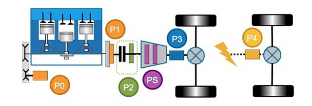其实在混合动力汽车中,按电机位置的不同可分为P0-P4以及Ps架构,其中P代表电机位置(Position),P后的数字越大,表示距离发动机的距离越远。不同位置的电机扮演着不同的角色,发挥的作用与车辆能耗、动力性有直接关系。
